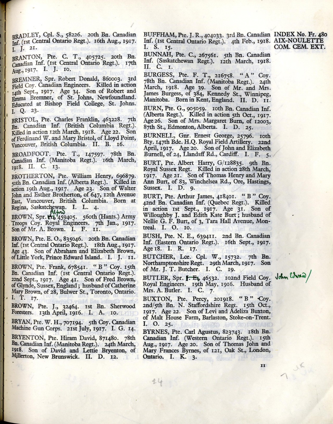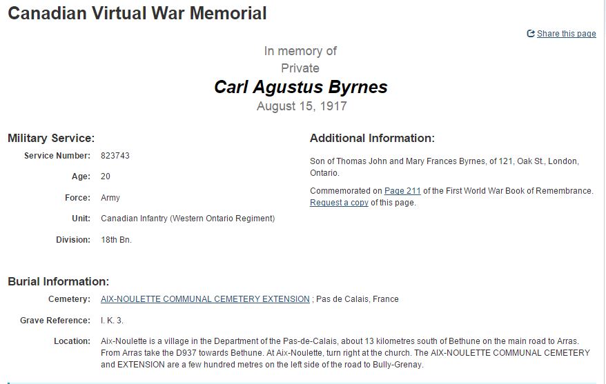 CVWM Page: This is a link to the CVWM Page. This pages gives information as to the date of death, age, and other pertinent information about the soldier. Below is a screen capture for Pte. Byrnes’ CVWM Page. It includes a picture, which is available for viewing lower on in the page.