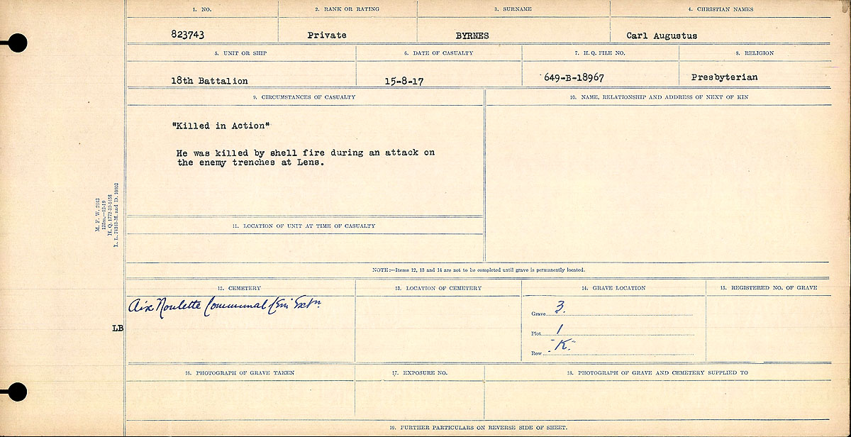 Byrnes, Carl Augustus: Service no. 823743