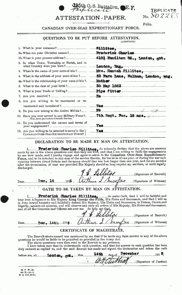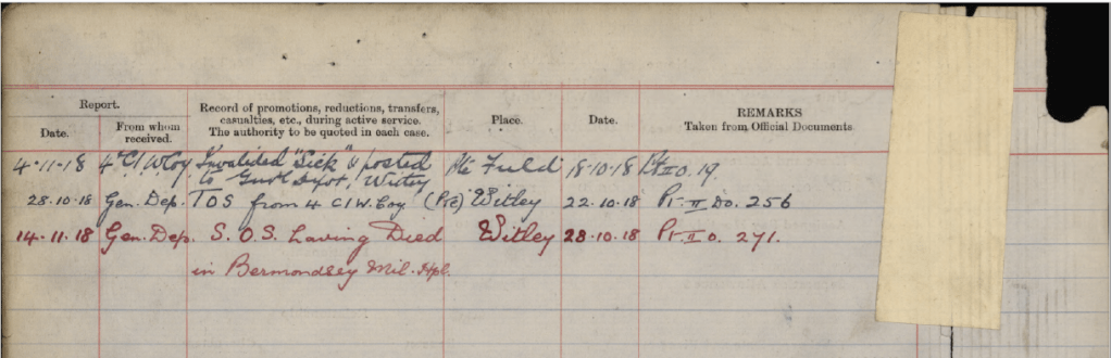 Served with the 18th Battalion from November 29, 1916 to September 1, 1917. Shows that he died while in service with 2nd Battalion. Was attached to the 4th Canadian Labour Battalion. Died of “disorded heart” and “pneumonia.