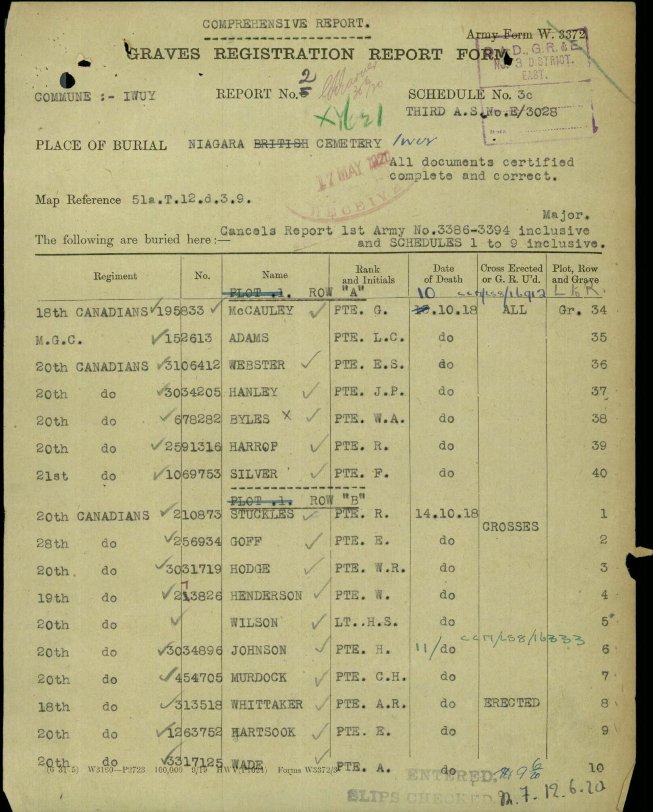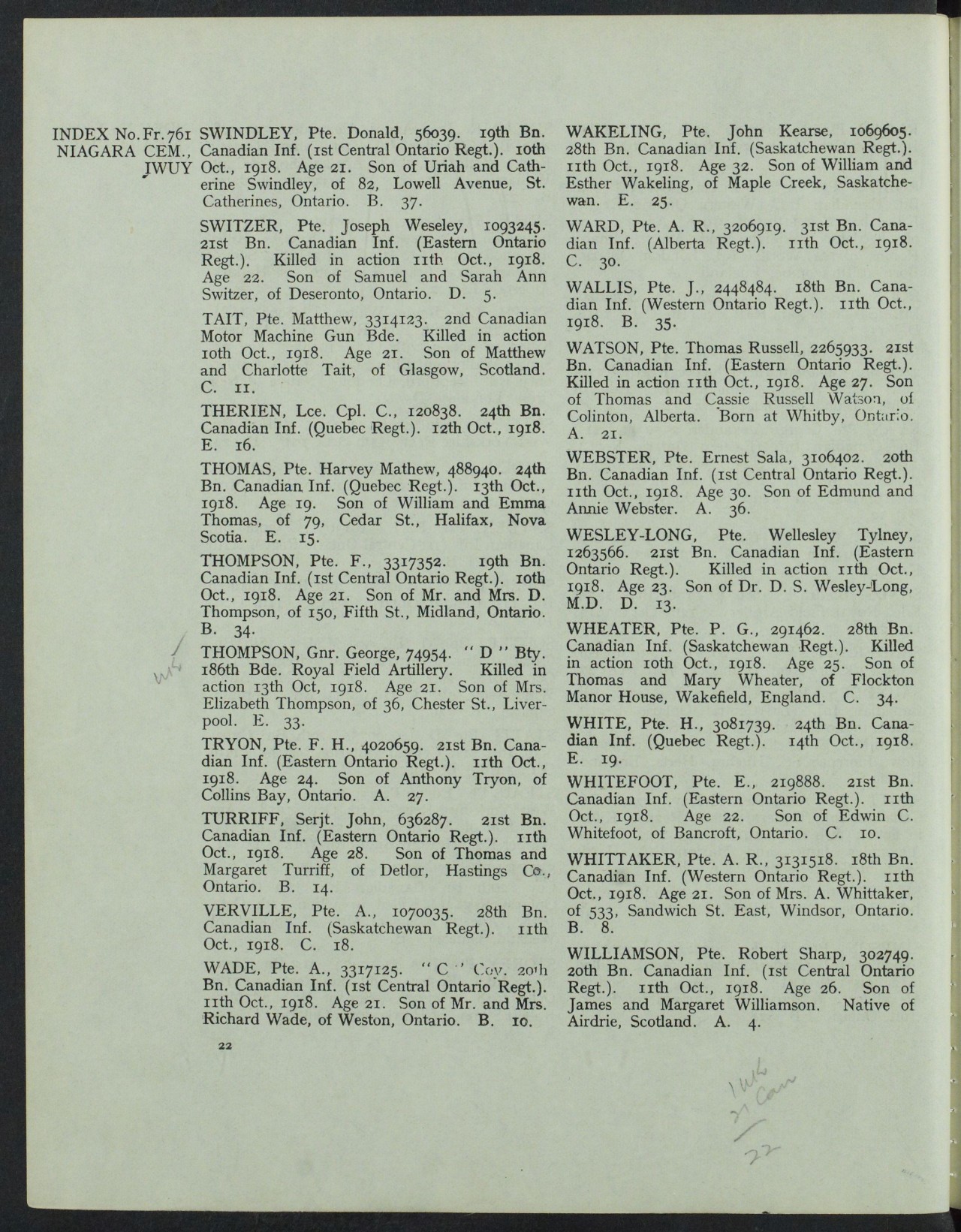 Family Search: When Private Alexander Russell Whittaker was born on 13 January 1896, in London Township, Middlesex, Ontario, Canada, his father, Francis Whittaker, was 27 and his mother, Annie Frances Richards, was 26. He lived in Essex, Ontario, Canada in 1911 and Windsor, Sandwich Township, Essex, Ontario, Canada in 1918. He registered for military service in 1918. In 1918, at the age of 22, his occupation is listed as plumber, r. padden plumbing in Windsor, Sandwich Township, Essex, Ontario, Canada. He died on 11 October 1918, in Iwuy, Nord, Nord-Pas-de-Calais, France, at the age of 22, and was buried in Niagara Cemetery, Iwuy, Nord, Nord-Pas-de-Calais, France.