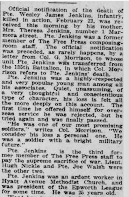 Jenkins, Wesley James: Service no. 802590 CVWM Page Digitized Service Record Source: Zorra Twp. Site Find-A-Grave Source: Operation Picture Me via The 18th Battalion Facebook Group. London Free Press Circa 1917. Source: London Free Press. Circa 1917. Contributed to the 18th Battalion Facebook Group by Operation Picture Me. “KILLED IN ACTION” Share this: Click to email a link to a friend (Opens in new window) Email Click to share on Facebook (Opens in new window) Facebook Click to share on X (Opens in new window) X Click to share on Reddit (Opens in new window) Reddit Click to share on LinkedIn (Opens in new window) LinkedIn Click to print (Opens in new window) Print Click to share on Tumblr (Opens in new window) Tumblr Click to share on Pocket (Opens in new window) Pocket Click to share on Pinterest (Opens in new window) Pinterest Click to share on Telegram (Opens in new window) Telegram Click to share on WhatsApp (Opens in new window) WhatsApp Like Loading...