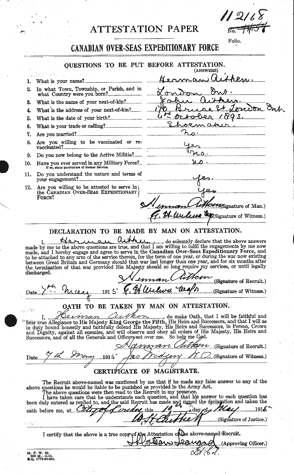 Family Search: When Corporal Herman Alfonso Aitken was born on 4 October 1893, in London Township, Middlesex, Ontario, Canada, his father, John Aitken, was 36 and his mother, Eliza Wade Rogers, was 26. He lived in Middlesex, Ontario, Canada in 1901. He registered for military service in 1915. In 1915, at the age of 22, his occupation is listed as shoemaker in London, Ontario, Canada. He died on 9 May 1917, at the age of 23, and is commemorated in Vimy, Pas-de-Calais, Hauts-de-France, France.