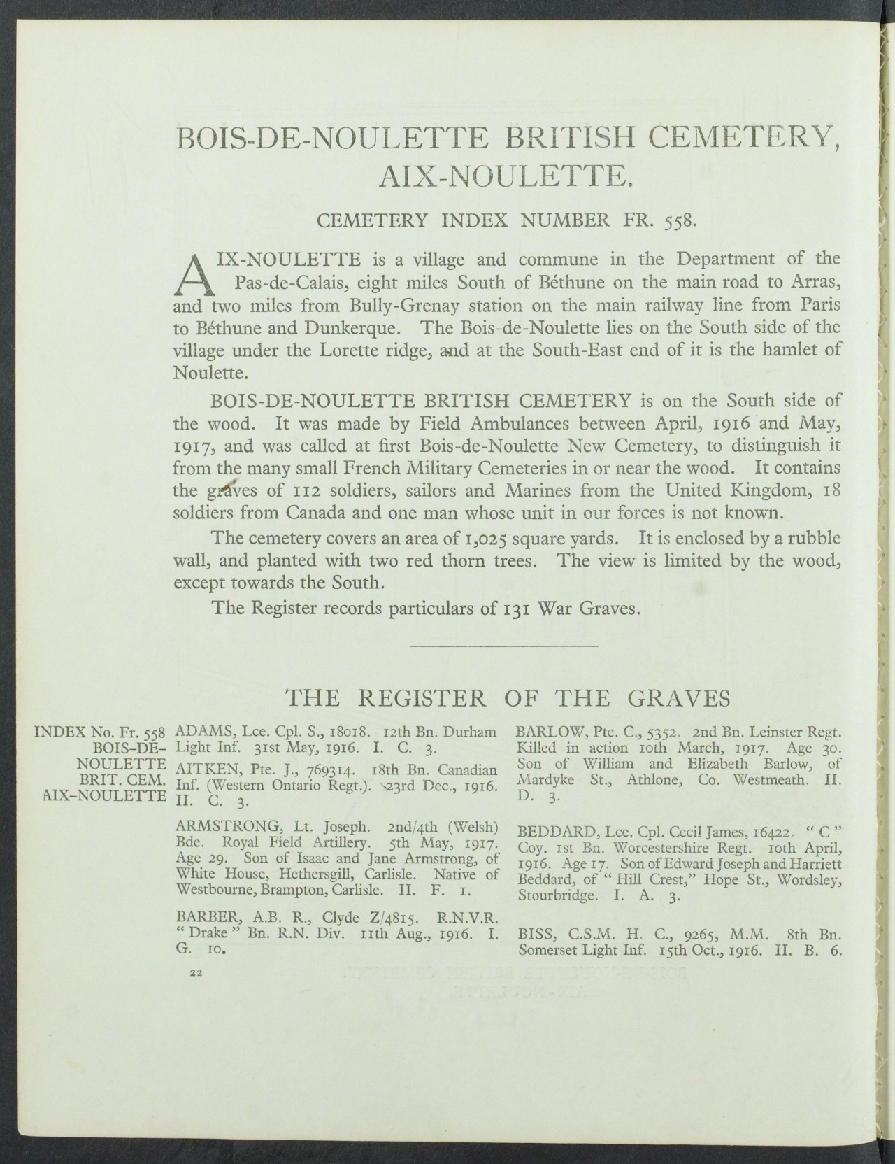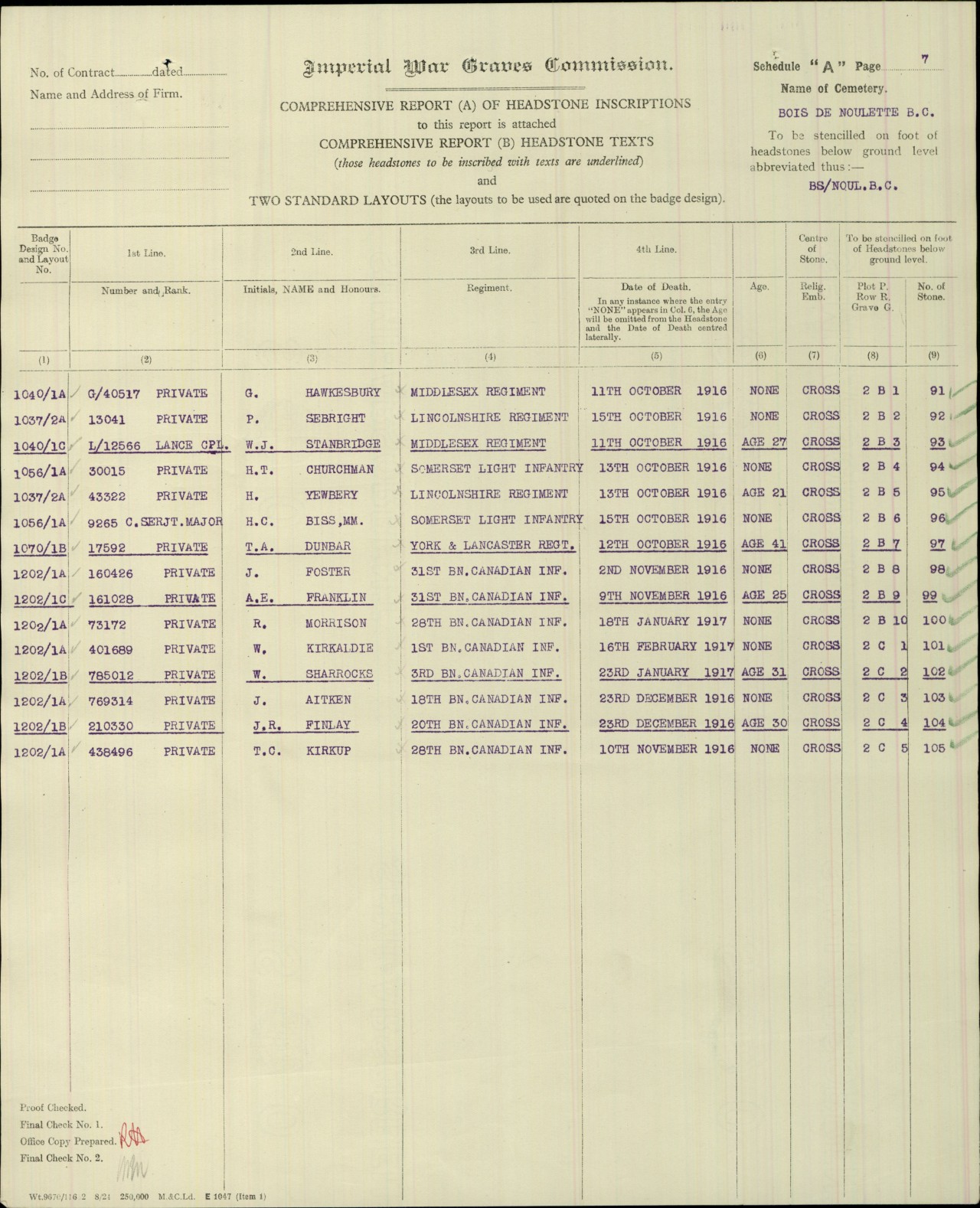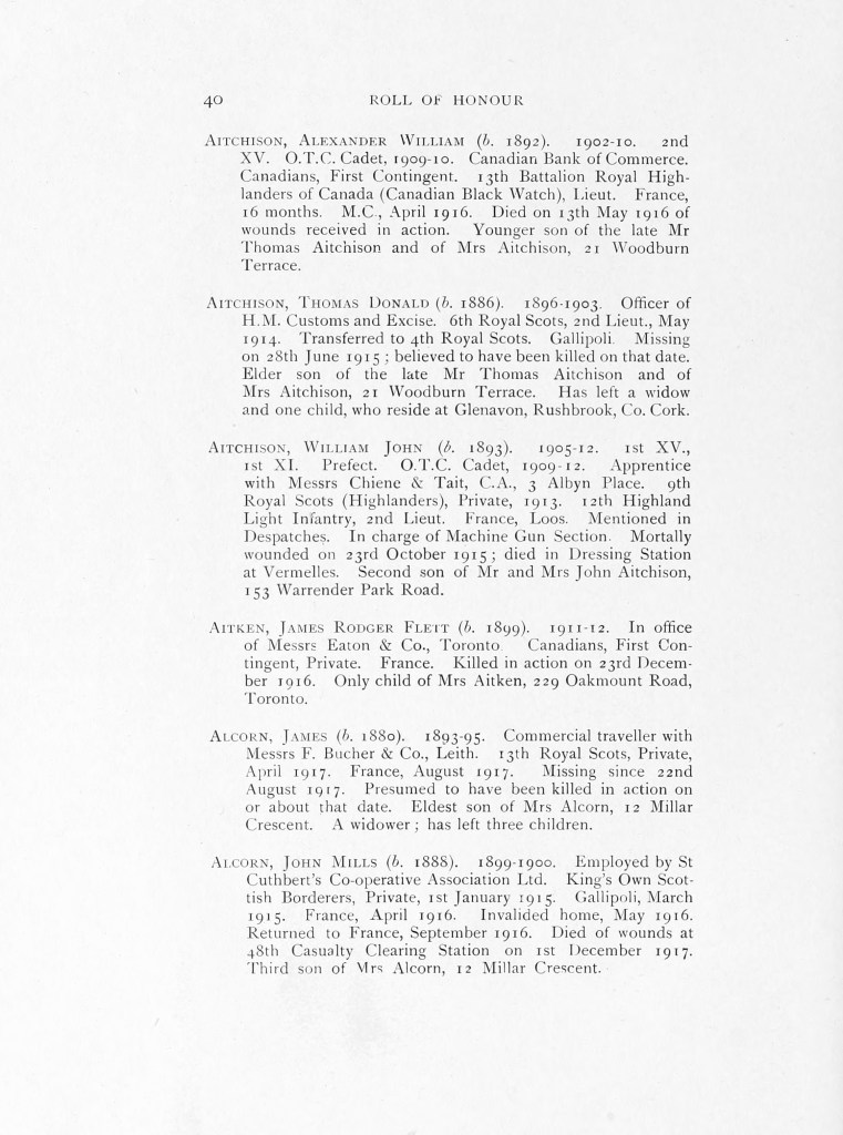 Family Search: When Private James Rodger Aitken was born on 15 August 1897, in Edinburgh, Scotland, United Kingdom, his father, Thomas Aitken, was 22 and his mother, Jemima Reid, was 25. He immigrated to Quebec City, Quebec, Canada in 1912 and lived in Toronto, Ontario, Canada in 1915. He registered for military service in 1915. In 1915, at the age of 18, his occupation is listed as clerk, mechanical draughtsman in Toronto, Ontario, Canada. He died on 23 December 1916, in Aix-Noulette, Pas-de-Calais, France, at the age of 19, and was buried in Aix-Noulette, Pas-de-Calais, France.