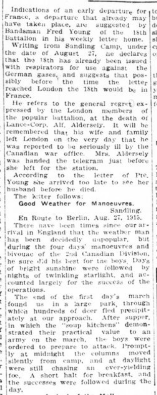 Family Search: When Corporal Alfred Charles Aldersley was born on 26 July 1874, in Kent, England, United Kingdom, his father, Charles Herbert Aldersley, was 34 and his mother, Mary Foster, was 27. He married Louisa Sophia Durbin on 1 April 1906, in Hounslow, Hounslow, London, England, United Kingdom. They were the parents of at least 2 daughters. He lived in St Pancras St Jude Gray’s Inn Road, London, England, United Kingdom in 1891 and Acton, Middlesex, England, United Kingdom in 1911. He registered for military service in 1914. In 191, his occupation is listed as labourer in London, Ontario, Canada. He died on 22 August 1915, in London, England, United Kingdom, at the age of 41, and was buried in London, England, United Kingdom.