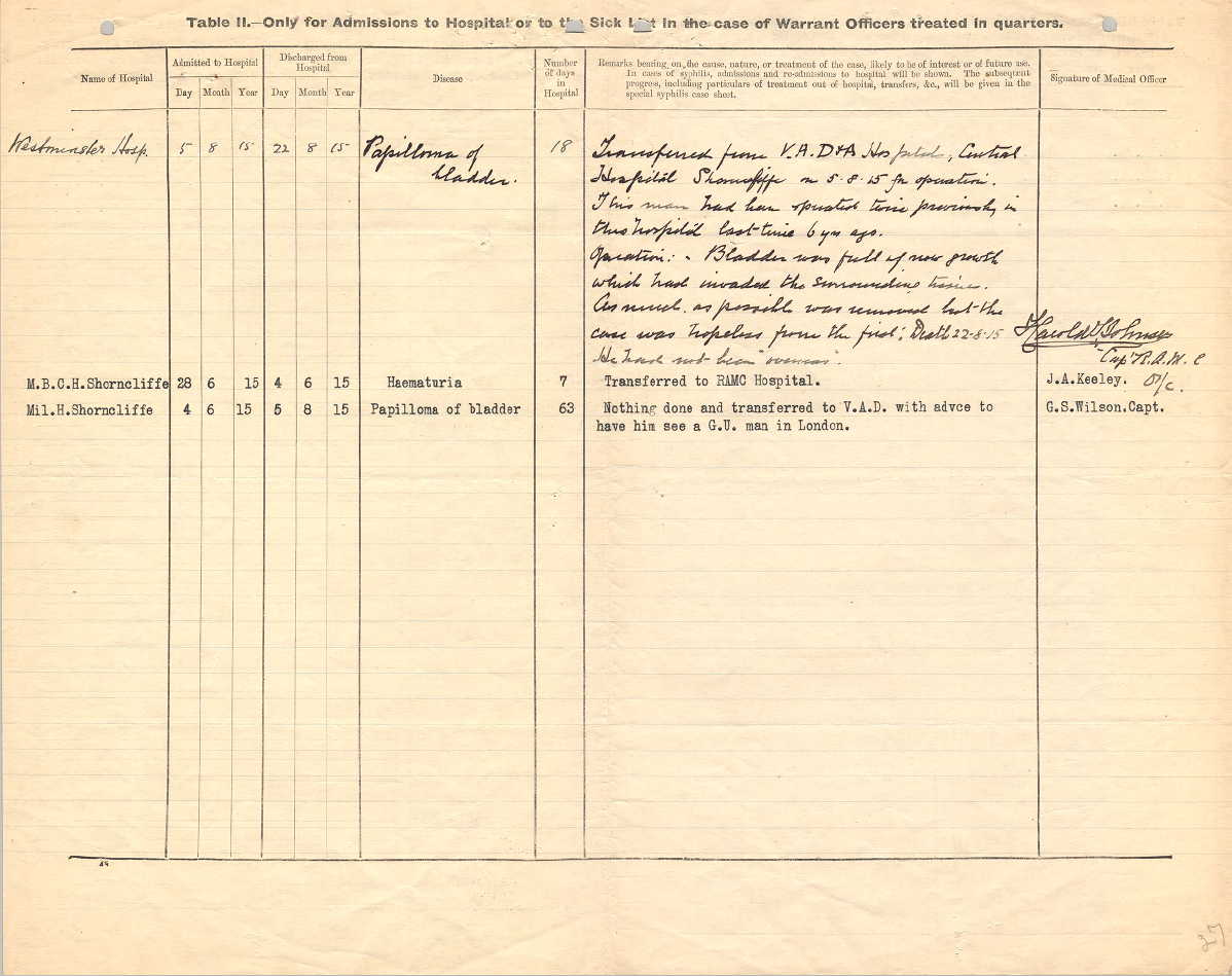 Operation: Bladder was full of [new] growth which had invaded the surrounding tissues. As much as possible was removed but this case was hopeless from the start. Death 22.8.15
