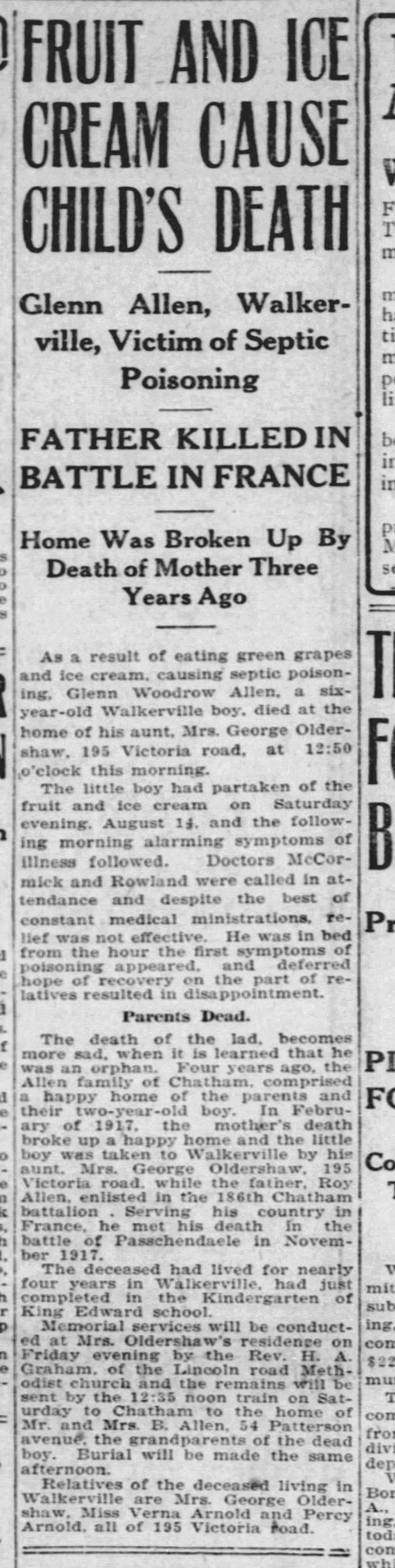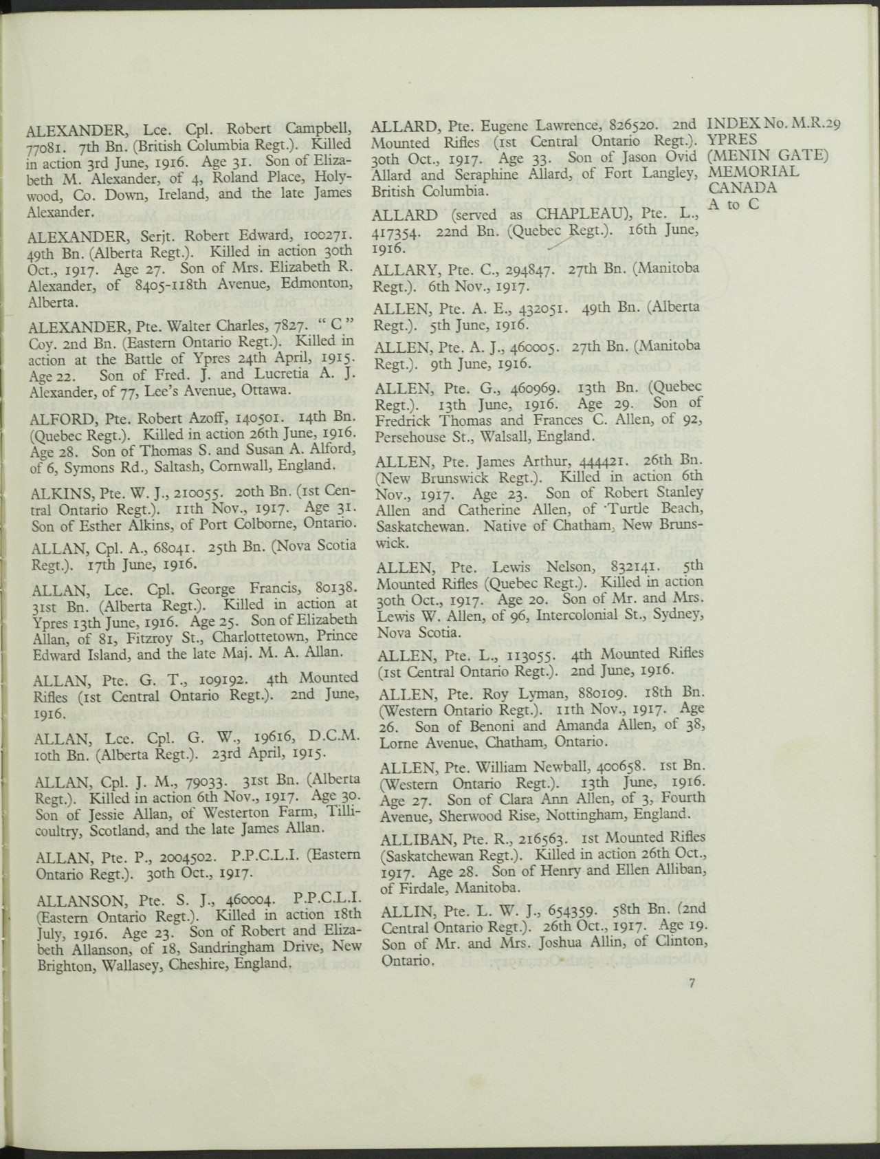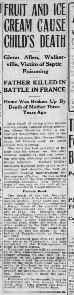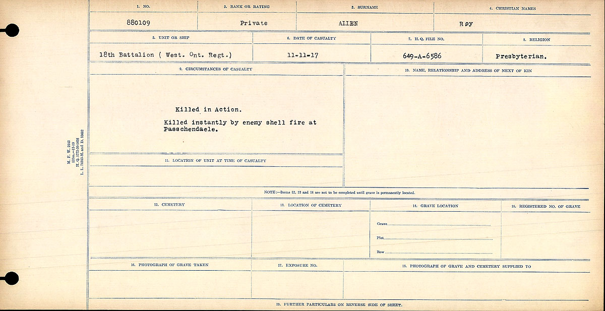 Allen, Roy Lyman: Service no. 880109 CVWM Page Digitized Service Record Source: Duty Nobly Done Roll of Honour 18th Bn. compiled and edited by Edward H. Wigney. Find-A-Grave Find-A-Grave: Canada Family Search: Private Roy Lyman Allen with his wife Florence and his son Glenn. Undated photo circa 1915. Source: CVWM “Killed in Action” Killed instantly by enemy shell fire at Passchendaele. Share this: Click to email a link to a friend (Opens in new window) Email Click to share on Facebook (Opens in new window) Facebook Click to share on X (Opens in new window) X Click to share on Reddit (Opens in new window) Reddit Click to share on LinkedIn (Opens in new window) LinkedIn Click to print (Opens in new window) Print Click to share on Tumblr (Opens in new window) Tumblr Click to share on Pocket (Opens in new window) Pocket Click to share on Pinterest (Opens in new window) Pinterest Click to share on Telegram (Opens in new window) Telegram Click to share on WhatsApp (Opens in new window) WhatsApp Like Loading...