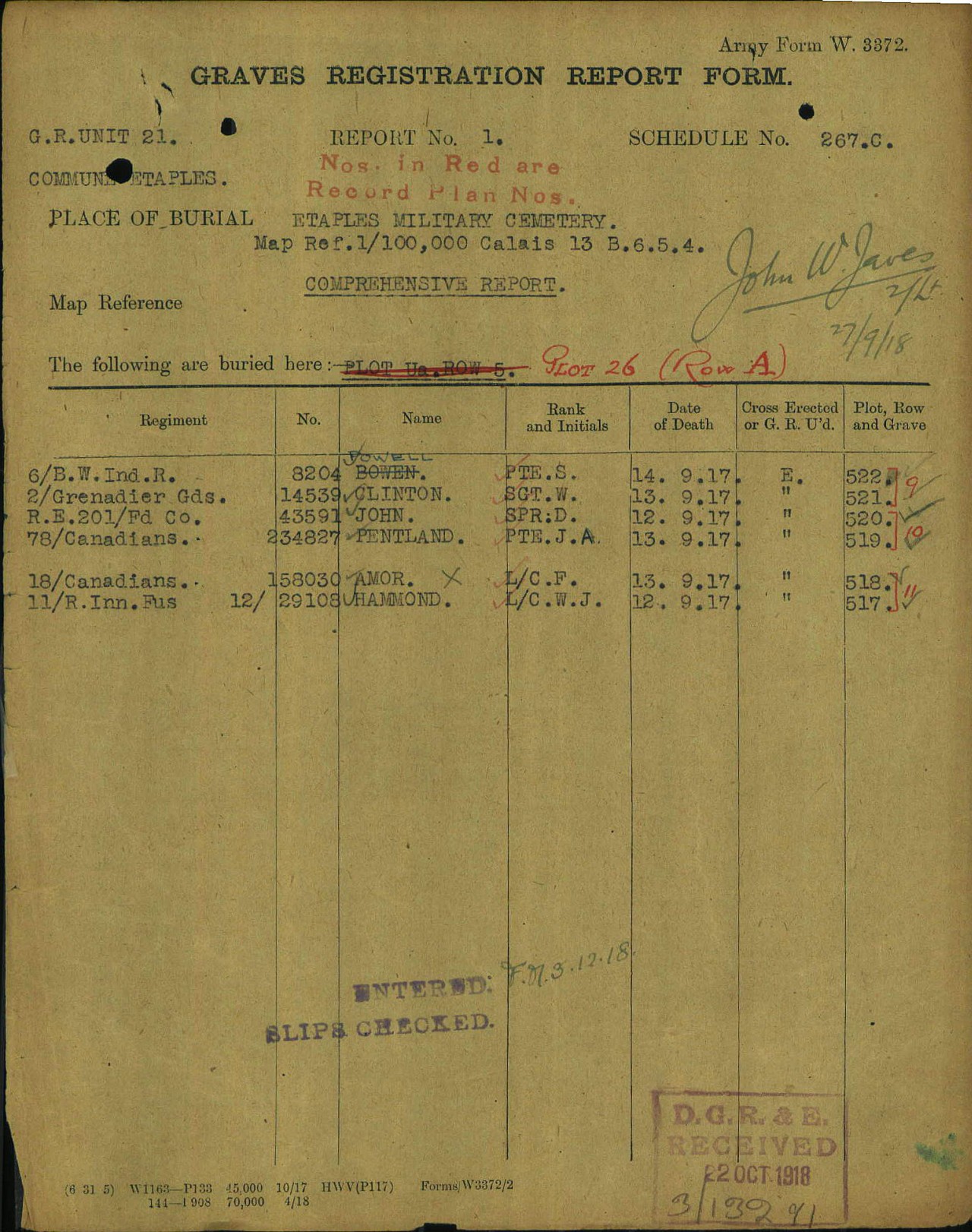 Family Search: When Private Frank Amor was born on 30 March 1892, in Shedfield, Hampshire, England, United Kingdom, his father, Frank Amor, was 34 and his mother, Emily Amor, was 35. He had at least 1 daughter. He immigrated to Canada in 1913 and lived in Toronto, Ontario, Canada in 1911. He registered for military service in 1915. In 1915, at the age of 23, his occupation is listed as gardener in Toronto, York, Ontario, Canada. He died on 13 September 1917, in Étaples, Montreuil, Pas-de-Calais, Nord-Pas-de-Calais, France, at the age of 25, and was buried in Etaples Military Cemetery, Étaples, Pas-de-Calais, Nord-Pas-de-Calais, France.