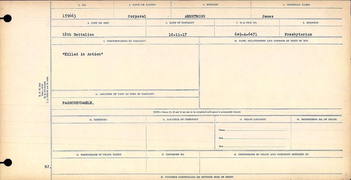 Family Search: Corporal James Keith Armstrong was born on 10 October 1887, in Paisley, Renfrewshire, Scotland, United Kingdom as the son of James Armstrong and Isabella. He registered for military service in 1915. In 1915, at the age of 28, his occupation is listed as labourer in Thorold, Welland, Ontario, Canada. He died on 10 November 1917, in Passendale, Zonnebeke, West Flanders, Belgium, at the age of 30, and was buried in Ieper, West Flanders, Belgium.