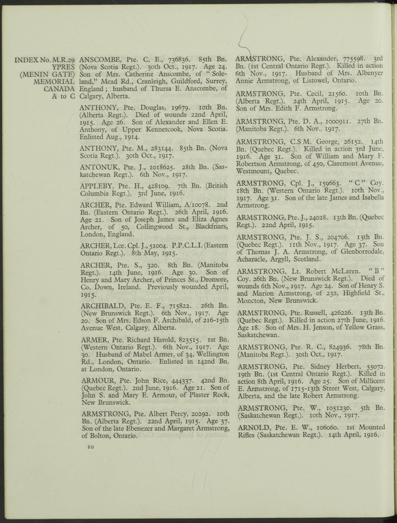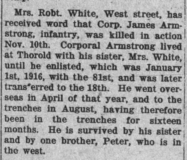 “My dear Mrs. Whyte: You no doubt have received the official notification of your brother, Corp. J. Armstrong, having been killed in action the 10th of this month.