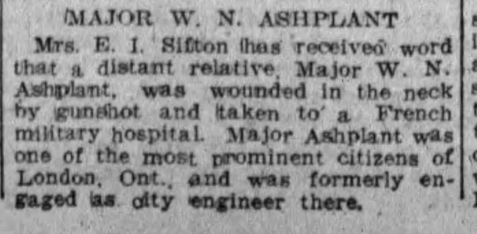 Family Search: Major William Norman Ashplant was born on 23 July 1877, in Haverhill, Suffolk, England, United Kingdom as the son of Henry Brimsmead Ashplant and Henrietta Bryant. He immigrated to Ellis Island, New York City, New York, United States in 1913 and lived in London, Ontario, Canada in 1915. He registered for military service in 1915. In 19, his occupation is listed as civil engineer in London, Ontario, Canada. He died on 22 September 1916, in Courcelette, Somme, Picardie, France, at the age of 39, and was buried in Vimy, Pas-de-Calais, Nord-Pas-de-Calais, France.