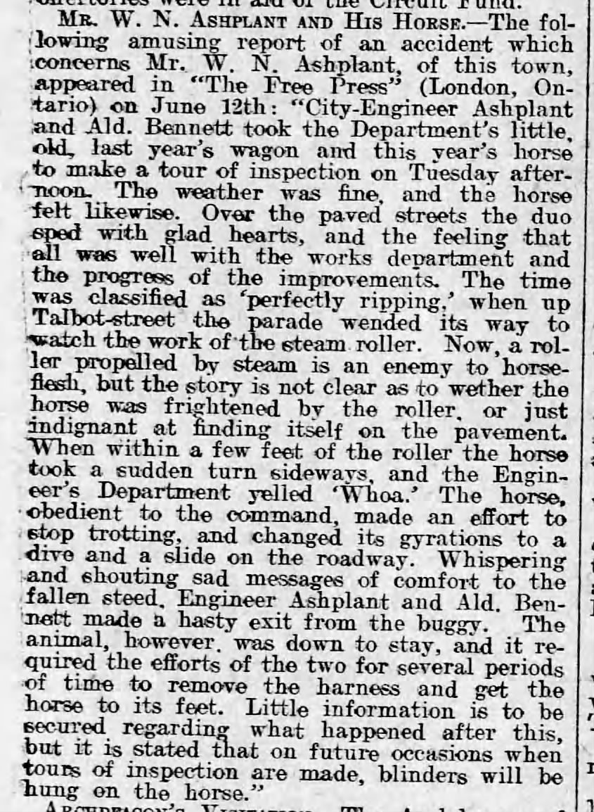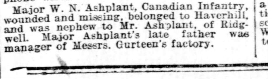 Family Search: Major William Norman Ashplant was born on 23 July 1877, in Haverhill, Suffolk, England, United Kingdom as the son of Henry Brimsmead Ashplant and Henrietta Bryant. He immigrated to Ellis Island, New York City, New York, United States in 1913 and lived in London, Ontario, Canada in 1915. He registered for military service in 1915. In 19, his occupation is listed as civil engineer in London, Ontario, Canada. He died on 22 September 1916, in Courcelette, Somme, Picardie, France, at the age of 39, and was buried in Vimy, Pas-de-Calais, Nord-Pas-de-Calais, France.