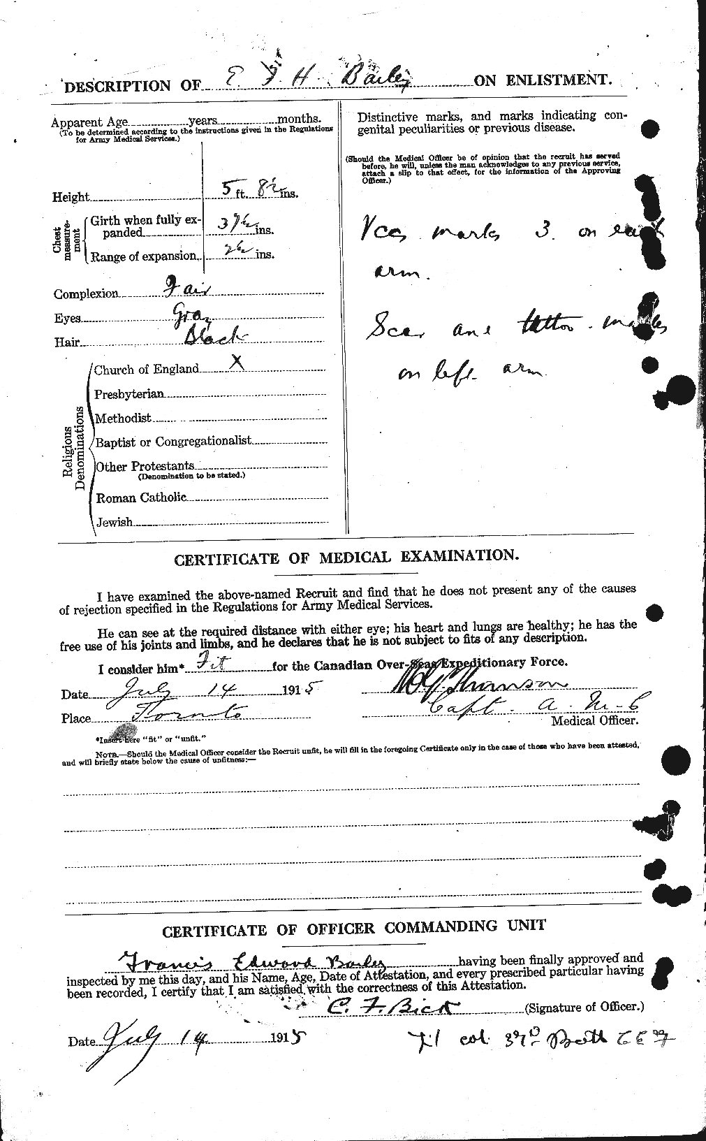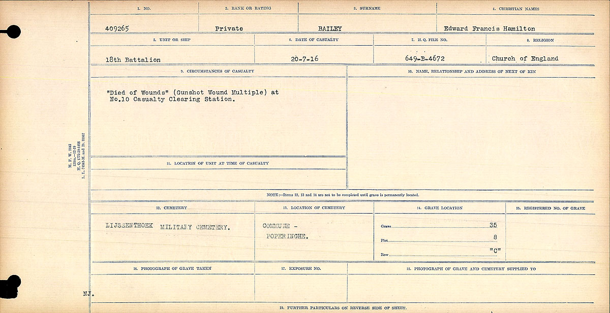Family Search: Private Edward Francis Hamilton Bailey was born on 3 June 1882, in Liskeard, Cornwall, England, United Kingdom. He had at least 2 sons and 3 daughters with Margaret Clarkson. He lived in York, Ontario, Canada in 1911 and East Toronto, Ontario, Canada in 1915. He registered for military service in 1915. In 1915, at the age of 33, his occupation is listed as motorman, toronto street railway in Toronto, Ontario, Canada. He died on 20 July 1916, in Lijssenthoek Military Cemetery, Poperinge, West Flanders, Belgium, at the age of 34, and was buried in Lijssenthoek Military Cemetery, Poperinge, West Flanders, Belgium.