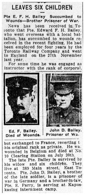 Note that Private Bailey died July 20, 1916. His widow Margaret Bailey died October 1, 1917 leaving 6 children as orphans in the care of a Guardian. A Samuel E. Perry, 66 Barrington Avenue, East Toronto, Ontario.