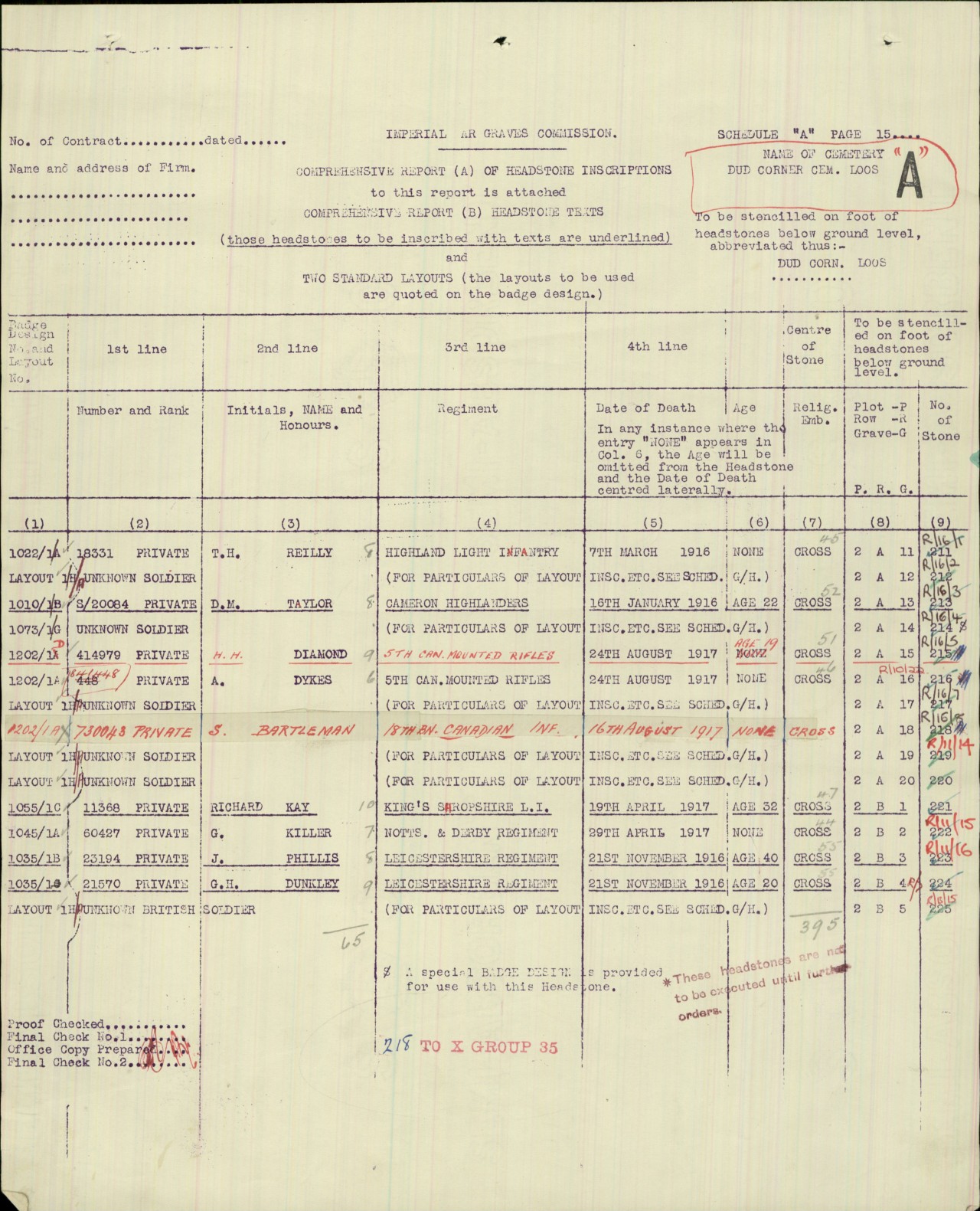 Find-A-Grave: When Private Scott Bartleman was born on 24 January 1884, in Banchory, Kincardineshire, Scotland, United Kingdom, his father, James Bartleman, was 30 and his mother, Jane Dunn, was 36. He immigrated to Canada in 1913. He registered for military service in 1915. In 1915, at the age of 31, his occupation is listed as chauffeur in Galt, Waterloo, Ontario, Canada. He died on 16 August 1917, in Loos-en-Gohelle, Pas-de-Calais, Hauts-de-France, France, at the age of 33, and was buried in Dud Corner Cemetery, Loos-en-Gohelle, Pas-de-Calais, Nord-Pas-de-Calais, France.