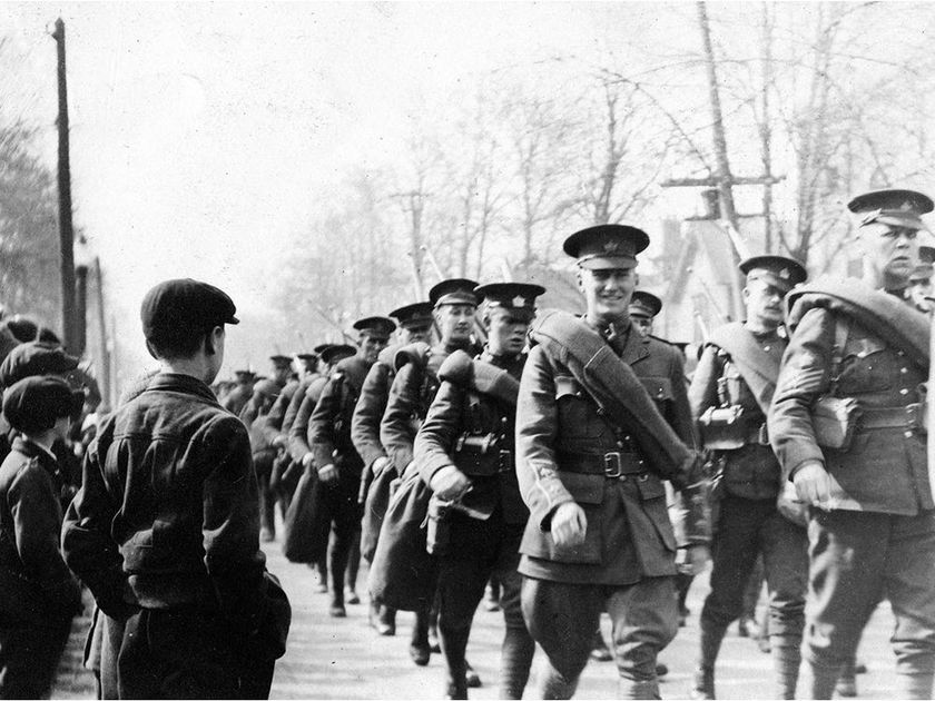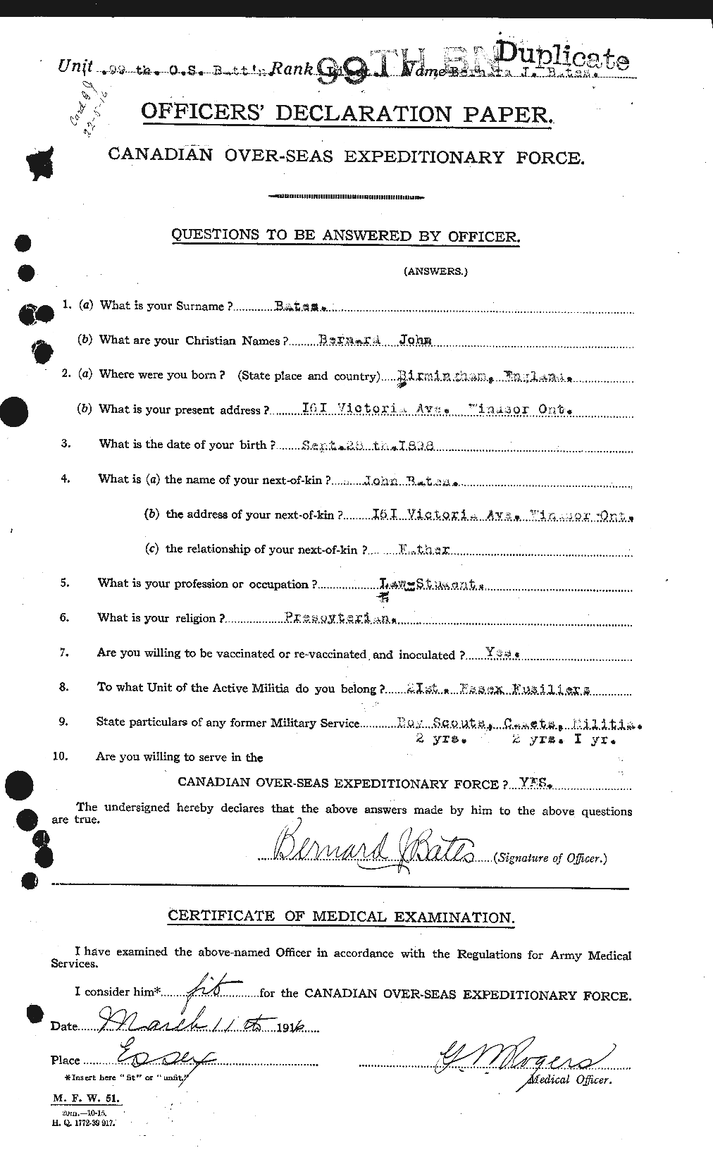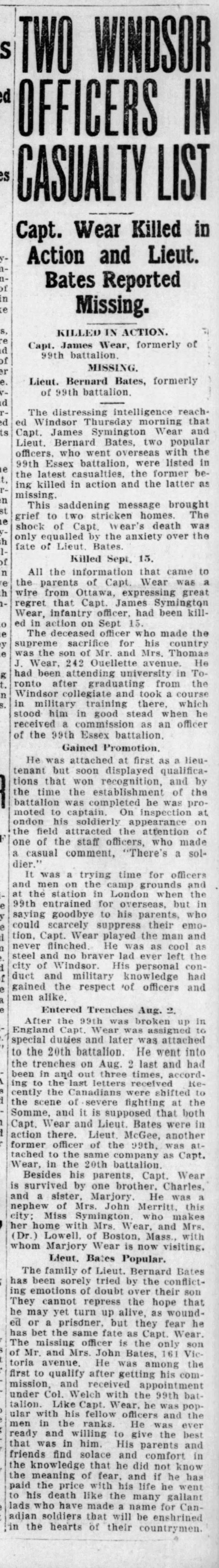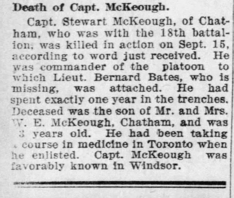 Family Search: Lieutenant Bernard John Bates was born on 28 September 1898, in Birmingham, West Midlands, England, United Kingdom as the son of John Bates and Mary Ann. He immigrated to Canada in 1910. He registered for military service in 1916. In 1916, his occupation is listed as student at law in Toronto, York, Ontario, Canada. He died on 15 September 1916, in Courcelette, Somme, Picardie, France, at the age of 17, and was buried in Adanac Military Cemetery, Miraumont, Somme, Picardie, France.