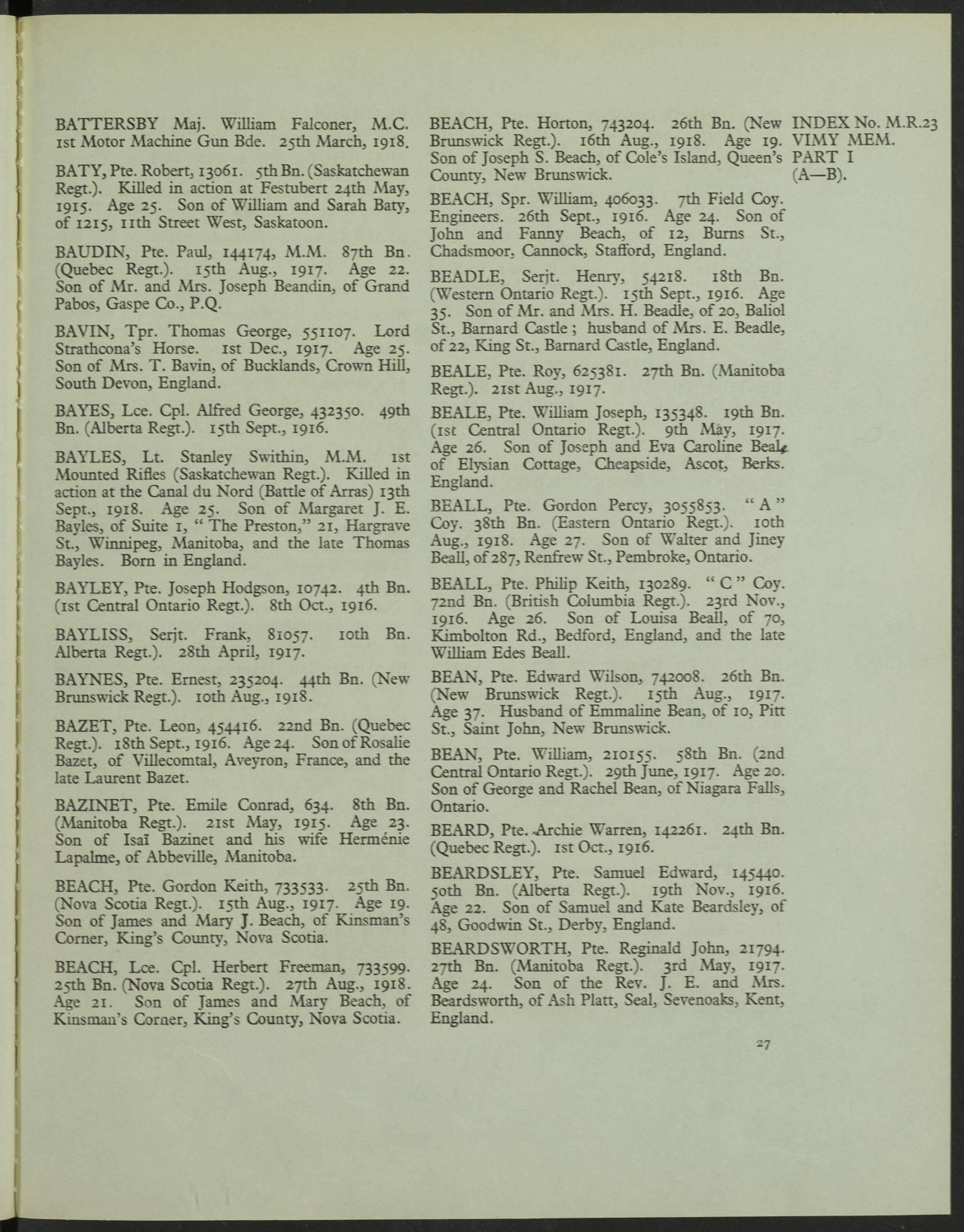 Family Search: Sergeant Henry Beadle was born on 23 May 1881, in Barnard Castle, Durham, England, United Kingdom as the son of H. Beadle and Hannah Beadle. He immigrated to Canada in 1913. He registered for military service in 1915. In 1915, at the age of 34, his occupation is listed as labourer. He died on 15 September 1916, in Courcelette, Somme, Picardie, France, at the age of 35.
