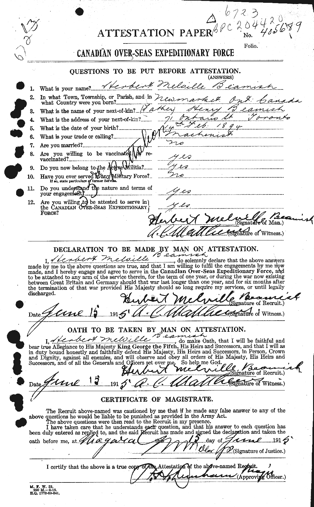 News has been received by Mrs. Gibson, of 99 Parliament st., that Pte. H.M. Beamish was killed in action on April 12. He enlisted for overseas service in May 1915 and had been in France about 13 months. He was born in Newmarket, Ont., 23 years aog, and was unmarried. One brother, Henry, went overseas last week. His father, H. Beamish, senior, is a Fenian Raid Veteran.
