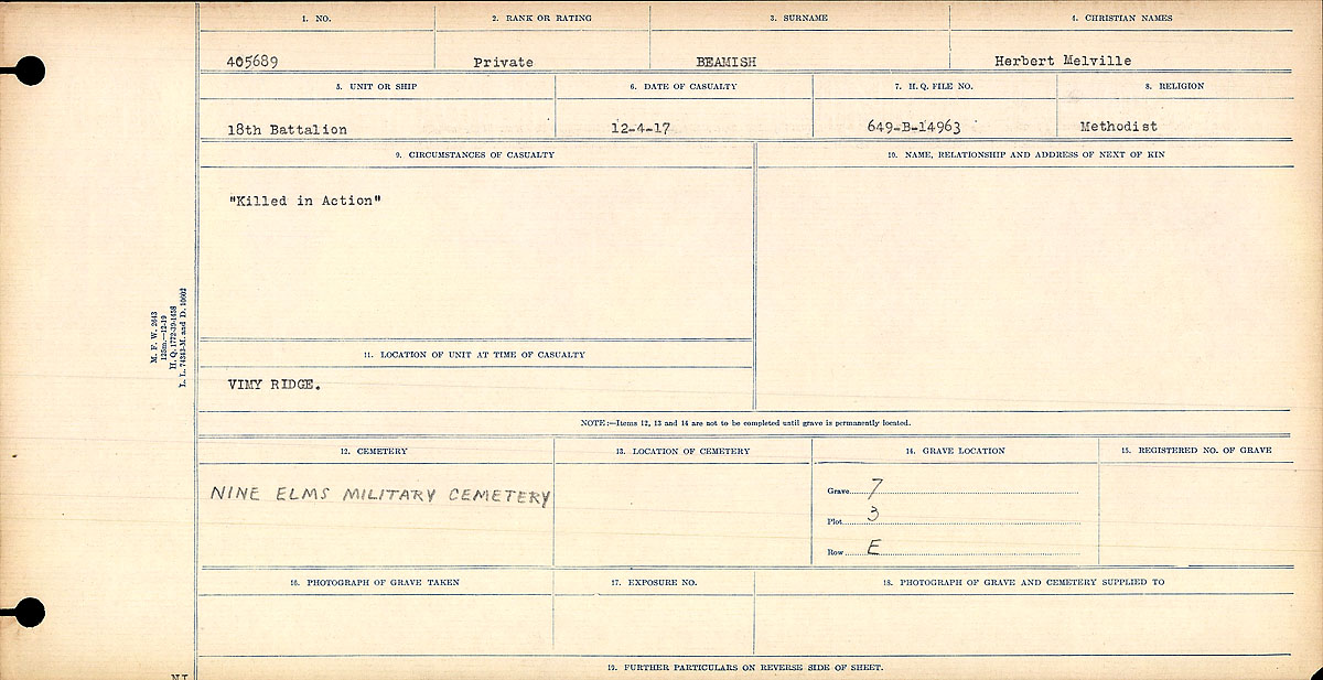 Beamish, Herbert Melville: Service no. 405689. Source: Toronto Telegram. May 1917. Per news clipping post by David Archer at 18th Battalion Facebook Page (not group).