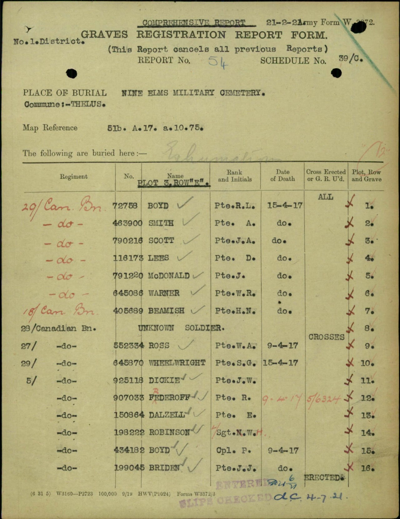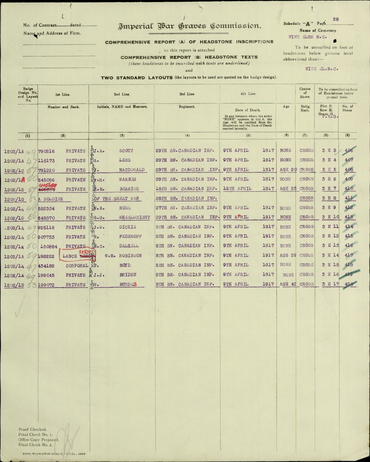 Grave Marker – Grave Marker – The grave marker at the Nine Elms Cemetery located outside Roclincourt, France. It is located about 5 kilometres from Canada’s Vimy Memorial. May he rest in peace. (John & Anne Stephens 2013). Source: CVWM