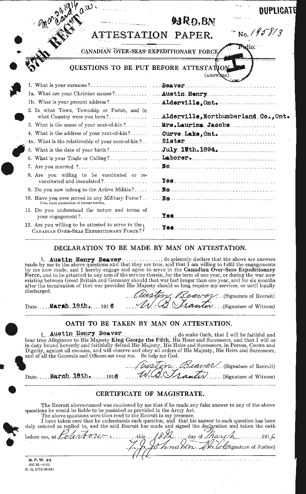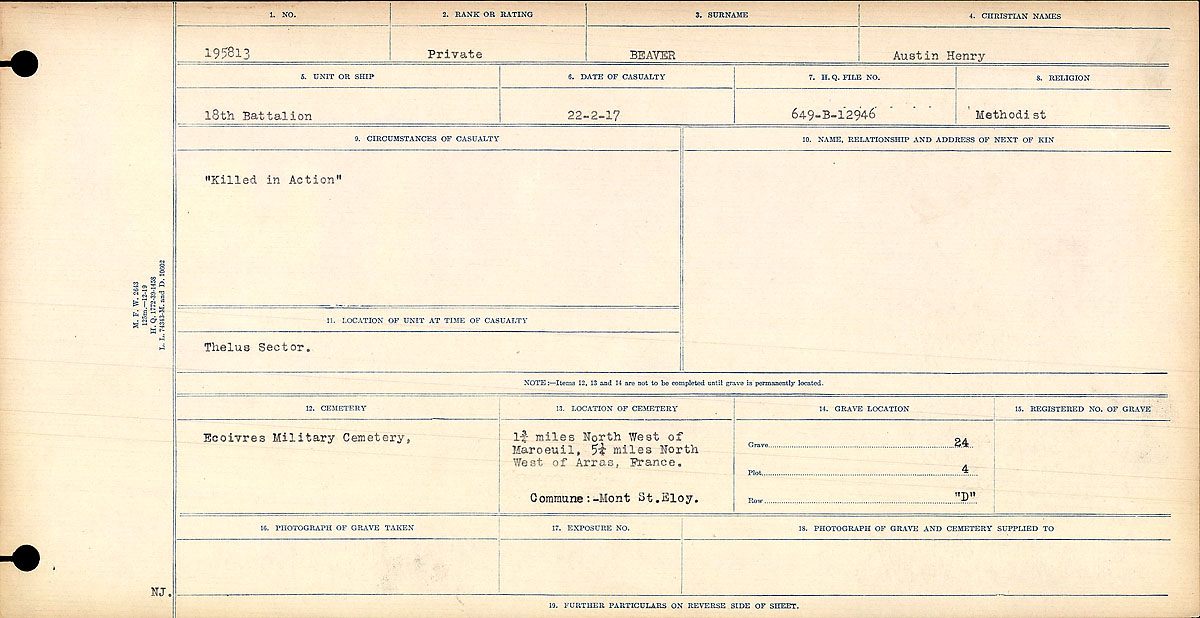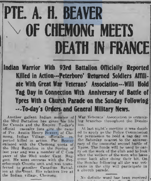 Beaver, Austin Henry: Service no. 195813 CVWM Page CWGC Digitized Service Record Aboriginal Veterans Tribute Source: February 1917 casualty. Find-A-Grave Source: The Evening Examiner. March 23, 1917. “Killed in Action.” Share this: Click to email a link to a friend (Opens in new window) Email Click to share on Facebook (Opens in new window) Facebook Click to share on X (Opens in new window) X Click to share on Reddit (Opens in new window) Reddit Click to share on LinkedIn (Opens in new window) LinkedIn Click to print (Opens in new window) Print Click to share on Tumblr (Opens in new window) Tumblr Click to share on Pocket (Opens in new window) Pocket Click to share on Pinterest (Opens in new window) Pinterest Click to share on Telegram (Opens in new window) Telegram Click to share on WhatsApp (Opens in new window) WhatsApp Like Loading...