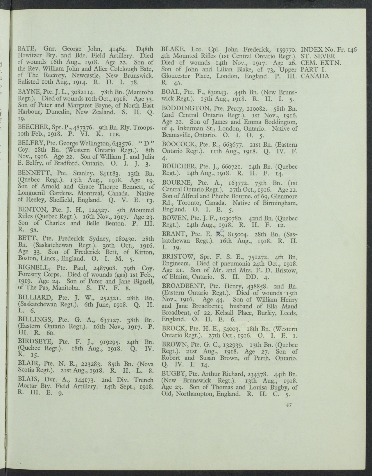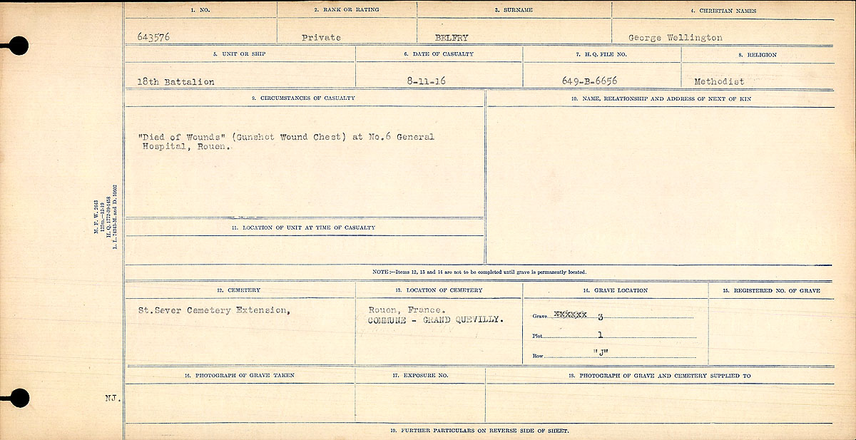 Family Search: When Private George Wellington Belfry was born on 22 January 1894, in Novar, Perry, Frontenac, Ontario, Canada, his father, William James Belfry, was 49 and his mother, Julia Elizabeth Cole, was 18. He lived in Simcoe, Ontario, Canada in 1911. He registered for military service in 191. In 1916, at the age of 22, his occupation is listed as farming in Bradford, West Gwillimbury, Simcoe, Ontario, Canada. He died on 8 November 1916, in Rouen, Seine-Maritime, Upper Normandy, France, at the age of 22, and was buried in Seine-Maritime, Normandy, France.