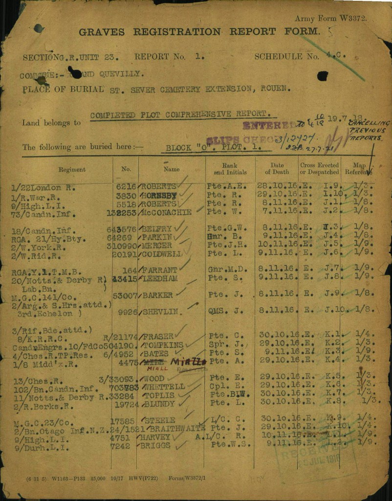 This man enlisted with the 157th Overseas Battalion at Bradford, Ontario on February 8, 1916. He was single and employed in farming. He went overseas arriving at Liverpool on May 5, 1916. He was transferred to the 18th Battalion from the 76th Reserve Battalion and arrived for active service on July 30, 1916. After a bout of influenza, he returned to duty on September 3, 1916. He was wounded on or about September 15, 1916, at the Somme during the Battle of Flers-Courcelette and died of those wounds at No. 6 General Hospital, Rouen, France.