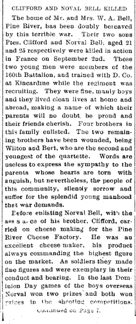 Family Search: When Private Norval Delbert Bell was born on 5 January 1893, in Brant, Ontario, Canada, his father, William Andrew Bell, was 31 and his mother, Fannie Wilton, was 28. He lived in Bruce, Ontario, Canada for about 10 years. He registered for military service in 1916. In 1916, at the age of 23, his occupation is listed as cheesemaker. He died on 2 September 1918, in France, at the age of 25, and was buried in Dury Mill British Cemetery, Dury, Pas-de-Calais, Nord-Pas-de-Calais, France.