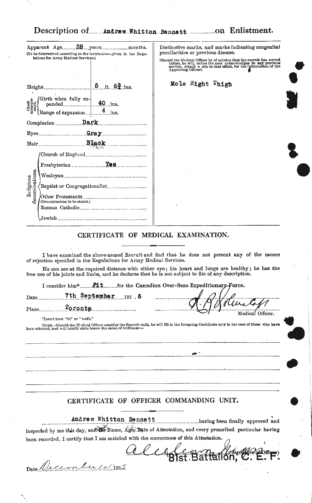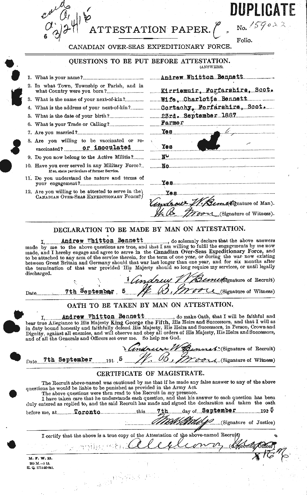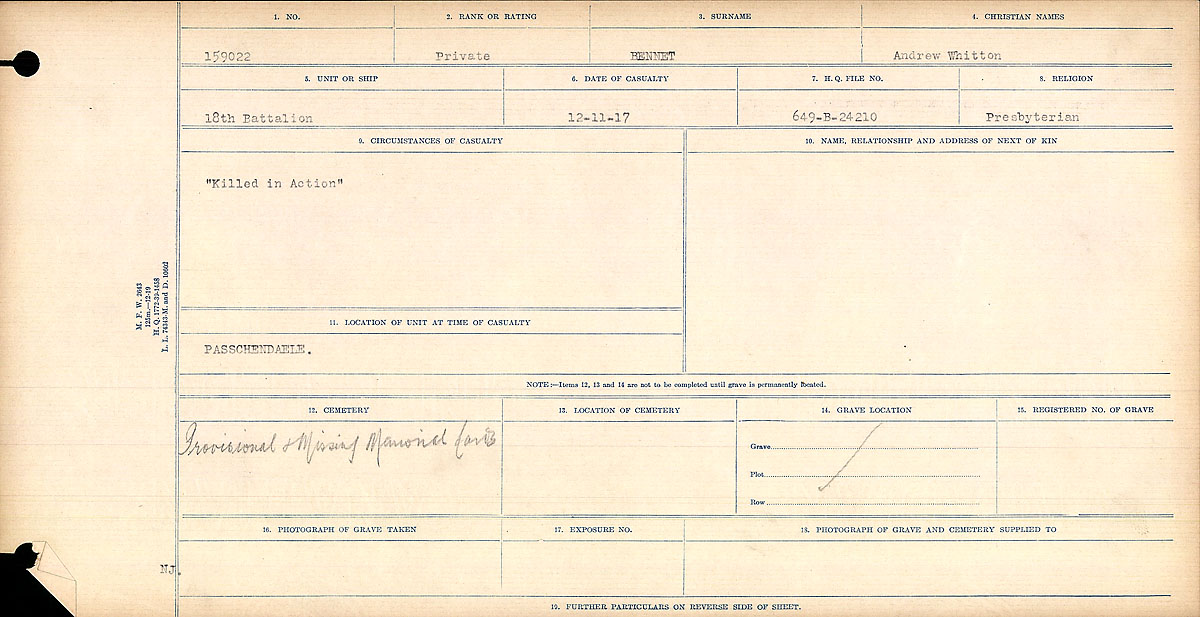 Corporal Andrew W. Bennet, 81st Canadians, was the son of A.D. Bennet, Little Cairne, Arbroath, formerly of St. Vigeans. He married Charlotte Lamond and left a son and a daughter. He was at one time employed as a ploughman near Arbroath but had been in Canada for some years when he joined the 81st Canadian Infantry in 1915. Corporal Bennet went to France the following year, and was killed in action at Paschendaele Ridge on the 12th of November 1917.