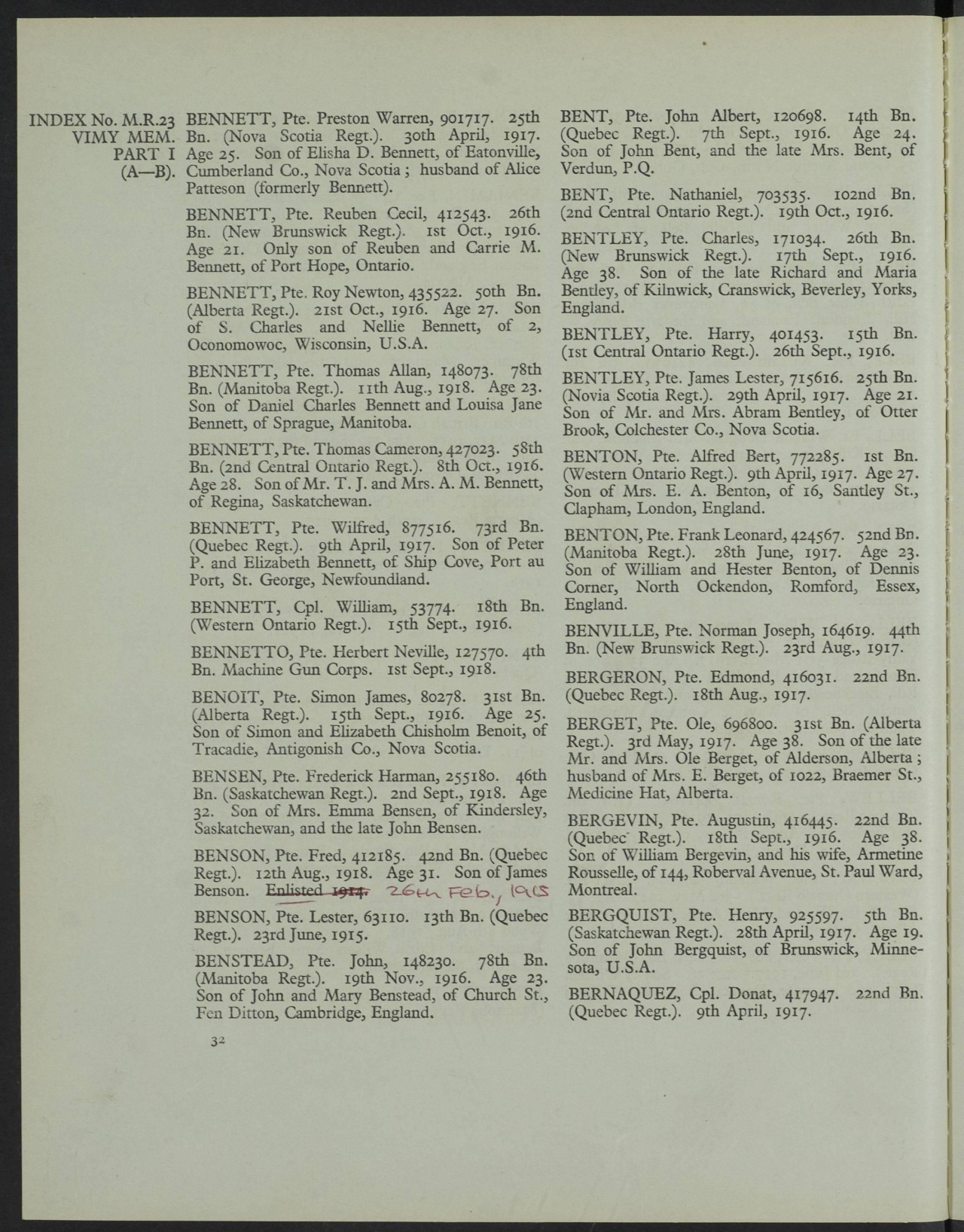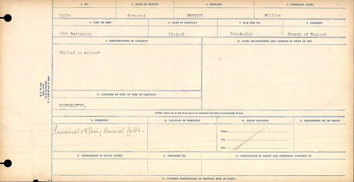 Family Search: When Corporal William Thomas Stephen Bennett was born on 10 October 1886, in Croydon, Surrey, England, United Kingdom, his father, William Webb Bennett, was 28 and his mother, Mary Ann Daws, was 18. He had at least 1 daughter with Rachel Wright. He immigrated to Canada in 1913 and lived in Wallasey, Cheshire, England, United Kingdom in 1886. He registered for military service in 1914. In 1914, at the age of 28, his occupation is listed as labourer. He died on 15 September 1916, in Courcelette, Somme, Picardie, France, at the age of 29.
