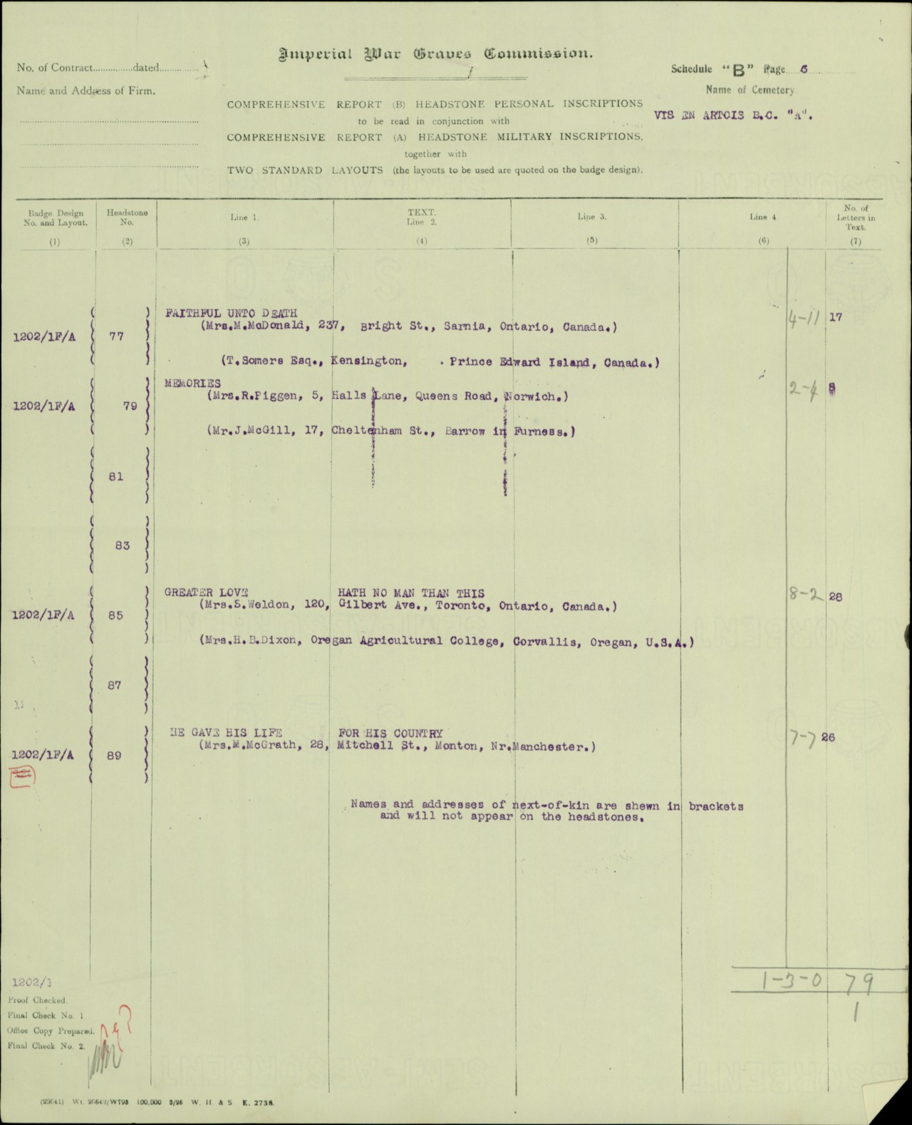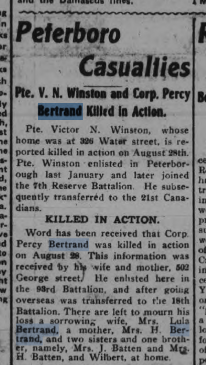 Family Search: When Sergeant Percy Bertrand was born on 7 May 1885, in Smith Township, Peterborough, Ontario, Canada, his father, Hiram Bertrand, was 28 and his mother, Adeline “Addie” McNaughton, was 22. He married Lula Emma Jane Davis on 10 July 1916, in Kingston, Frontenac, Ontario, Canada. He lived in Peterborough, Ontario, Canada for about 15 years. He registered for military service in 1916. In 1916, at the age of 31, his occupation is listed as labourer in Peterborough, Ontario, Canada. He died on 28 August 1918, in Vis-en-Artois, Pas-de-Calais, Nord-Pas-de-Calais, France, at the age of 33, and was buried in Vis-en-Artois British Cemetery and Memorial, Haucourt, Pas-de-Calais, Nord-Pas-de-Calais, France.
