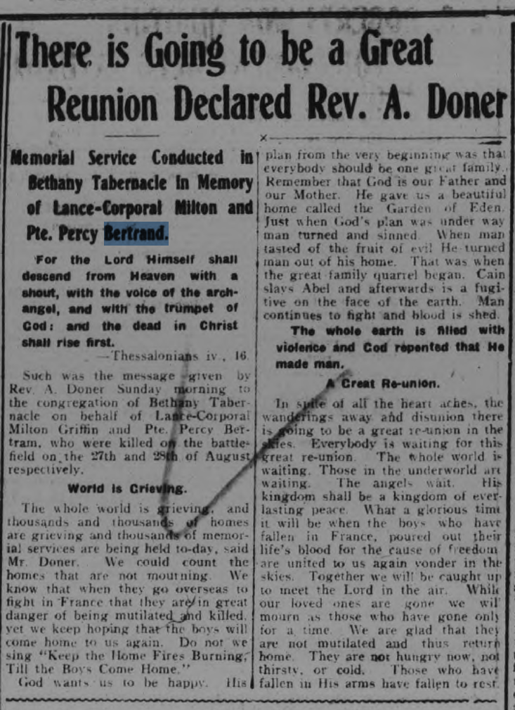 Private Percy Bertrand – 195821 – Active Service (World War I)