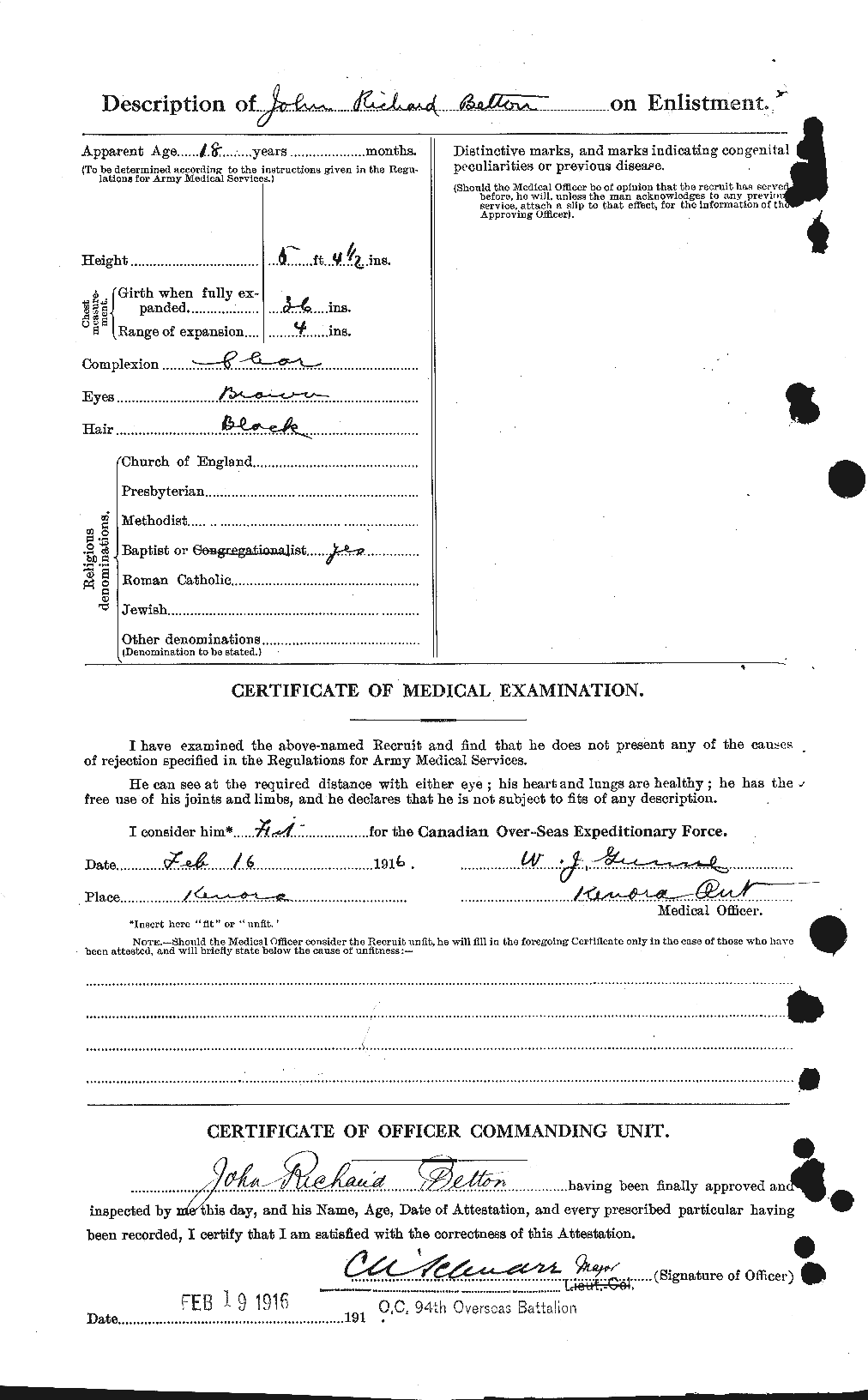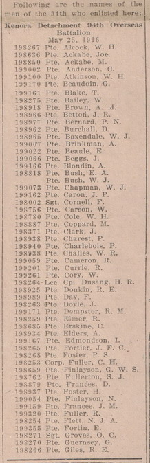 John Richard Betton enlisted in Kenora on 16 February 1916. Brown-eyed with black hair, he was only 17. With the 94th Battalion, John left Kenora by train on 25 May 1916, destination Port Arthur, Ontario. “On May 25, 1916, the men of “C” an “D” Companies from Kenora and Fort Frances were moved to the Lakehead and on June 9, 1916, the Battalion left for Valcartier, Quebec for “Summer Camp” as it was called. For two hundred and five of these men it was the last time they were to see their families and friends. The 94th trained at Valcartier for a period until June 13th when they sailed from Halifax for England on the RMS Olympic. Although the 94th remained a battalion on paper until July 27th, 1918, with an office at East Sandling, if actually ceased to exist on July 13th, 1916 when it was broken up and the men were transferred to the 17th and 32nd Reserve Battalions to be used as replacements for casualties in front line units.”Once overseas, John was transferred to the 17th Reserve Battalion, to the 30th Reserve Battalion in September, to the 32nd Reserve Battalion in December, and then to the 161st Battalion in February of 1917. In February of 1918 he proceeded overseas for service with the 18th Battalion, taken on strength in the field in early April. Afflicted with scabies, he spent most of the month of June at the 2/2 London Field Ambulance.