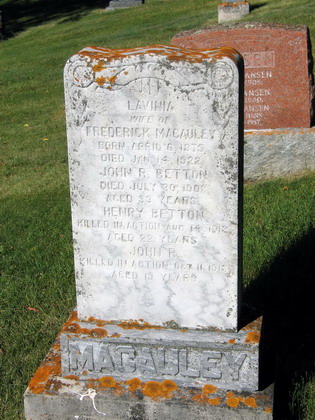 The Betton family was next found on a passenger list for the Empress of Ireland that left Liverpool in April of 1908, destination given as Kenora, Ontario. Two more children had been added to the family, Albert and Frank (Fred). Travelling with the family was Frank (Fred) Macauley. Only months later, John lost his life in an accident in the Canadian Pacific Railway yards on 31 July 1908. In February of 1912, Lavinia married Frederick Macauley in Kenora. The family took up residence at 506 5th Street North.
