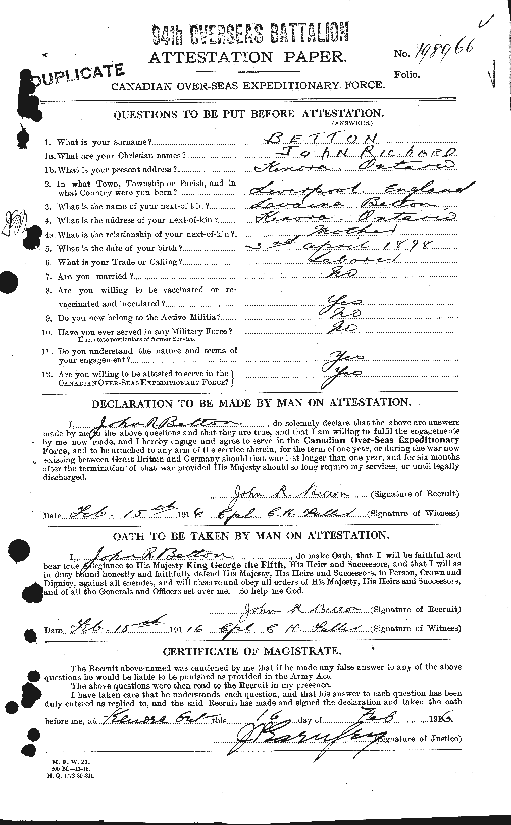 Once his enlistment was complete, Pte. Betton was sent to Valcartier, P.Q., for training. On June 28, 1916, he sailed with his battalion for England.