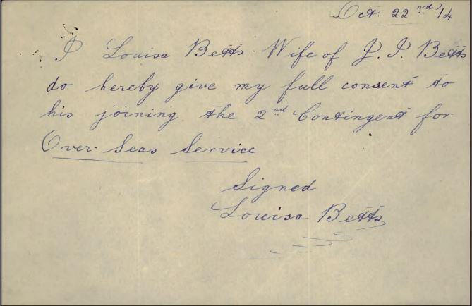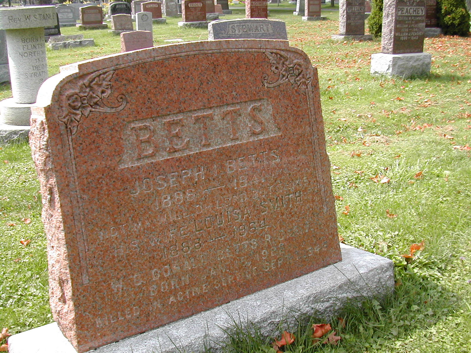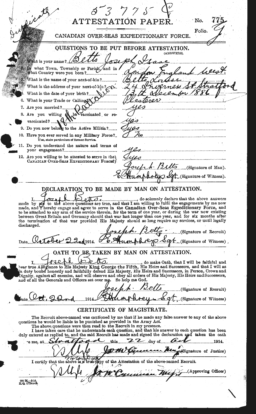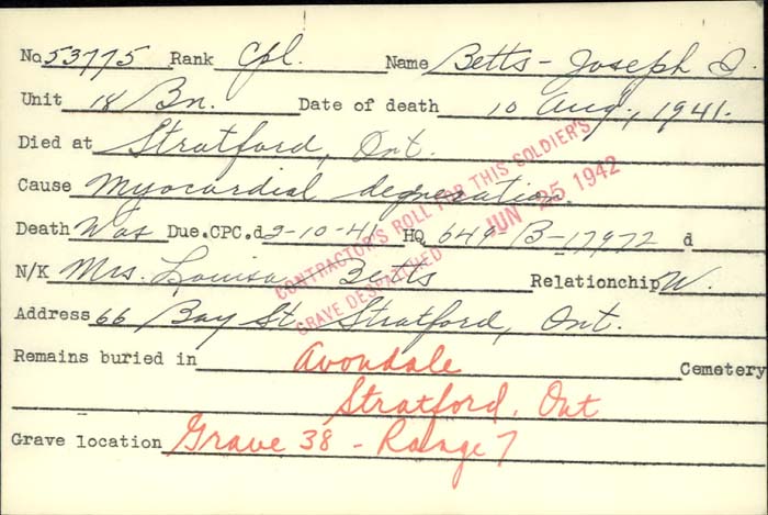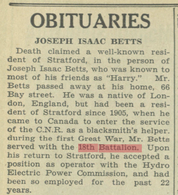 Family Search: When Corporal Joseph Isaac Betts was born on 13 December 1886, in London, England, United Kingdom, his father, Mr Joseph Betts, was 22 and his mother, Miss Charlotte Dean, was 18. He married Louisa Smith on 9 May 1908, in Stratford, Perth, Ontario, Canada. They were the parents of at least 2 sons and 4 daughters. He lived in Hammersmith, London, England, United Kingdom for about 10 years and Perth, Ontario, Canada in 1911. He registered for military service in 1914. In 1919, his occupation is listed as operator, hydro electric commission in Stratford, Perth, Ontario, Canada. He died on 10 August 1941, in Stratford, Perth, Ontario, Canada, at the age of 54, and was buried in Avondale Cemetery, Stratford, Perth, Ontario, Canada.