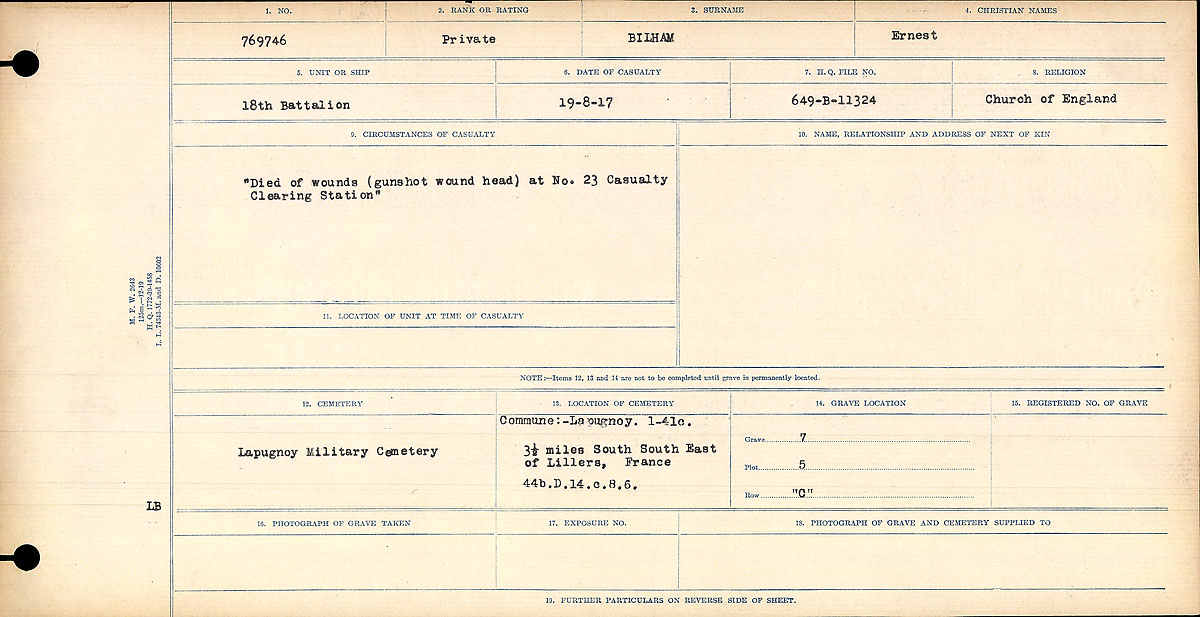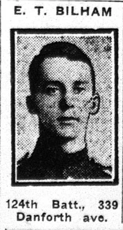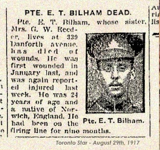 Pte. E.T. Bilham, whose sister, Mrs. G.W. Reeder, lives at 339 Danforth avenue, had died of wounds. He was first wounded in January last, and was again reported injured last week. He was 24 years of age and a native of Norwich, England. He had been on the firing line for nine months.