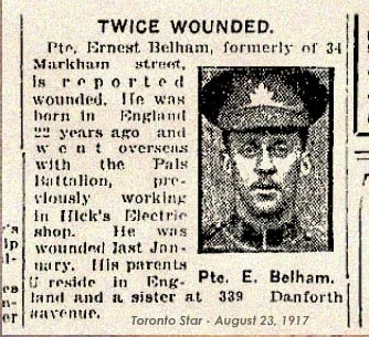 Pte. Ernest Belham [sic], formerly of 34 Markham street, is reported wounded. He was born in England 22 years ago and went overseas with the Pals Battalion, previously working in Hick’s Electric shop. He was wounded last January. His parents reside in England and a sister at 339 Danforth avenue.