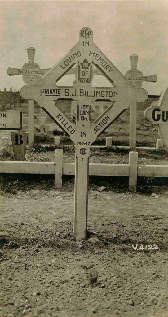 Family Search: When Samuel James Billington was born on 1 November 1888, in Sandbach, Cheshire, England, United Kingdom, his father, Samuel Billington, was 28 and his mother, Hannah Elizabeth Witter, was 26. He immigrated to Canada in 1910 and lived in Elworth, Cheshire, England, United Kingdom in 1889 and Church Hulme, Cheshire, England, United Kingdom in 1901. He registered for military service in 1915. In 1915, at the age of 27, his occupation is listed as farm hand in Thorndale, Thames Centre, Middlesex, Ontario, Canada. He died on 28 May 1917, in Vimy, Pas-de-Calais, Nord-Pas-de-Calais, France, at the age of 28, and was buried in Neuville-Saint-Vaast, Pas-de-Calais, Nord-Pas-de-Calais, France.