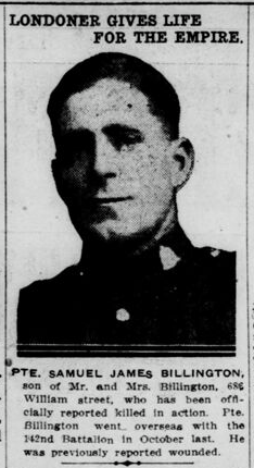 Family Search: When Samuel James Billington was born on 1 November 1888, in Sandbach, Cheshire, England, United Kingdom, his father, Samuel Billington, was 28 and his mother, Hannah Elizabeth Witter, was 26. He immigrated to Canada in 1910 and lived in Elworth, Cheshire, England, United Kingdom in 1889 and Church Hulme, Cheshire, England, United Kingdom in 1901. He registered for military service in 1915. In 1915, at the age of 27, his occupation is listed as farm hand in Thorndale, Thames Centre, Middlesex, Ontario, Canada. He died on 28 May 1917, in Vimy, Pas-de-Calais, Nord-Pas-de-Calais, France, at the age of 28, and was buried in Neuville-Saint-Vaast, Pas-de-Calais, Nord-Pas-de-Calais, France.