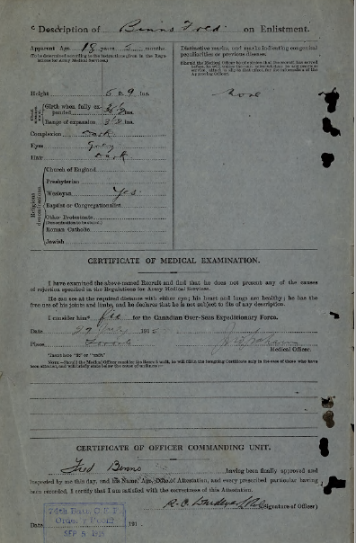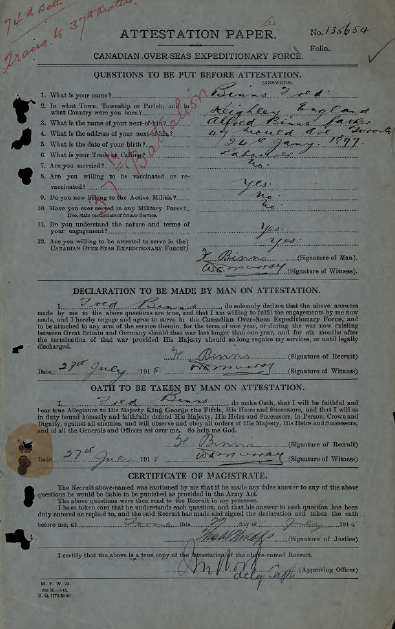 Fred signed his attestation papers in Toronto on July 5th 1915 and was assigned to the 37th battalion. He sailed with his battalion from Halifax arriving in England Dec-11-1915 on the SS Lapland. Upon arriving in England he was with the 12th reserve battalion in Shorcliffe [Shornecliffe]. He was then taken on strenght [sic] in March 1916. At this point he was transfered [sic] to the 18th Shorncliffe 12th reserve battalion in France on May 7 1916. On May 8 1916 he was taken on strenght to the 18th Canadian Battalion. May 31 1916 Fred proceded to join his unit in the field. On Oct 1 1916 fred [sic] was wounded in the right thigh by shrapnel and was sent to the 2nd Scottish General Hospital in Edinburgh to have the troublsome [sic] piece removed. He spent 54 days in recovery before being sent to the Kings Canadian Red Cross conv [convalescent] hospital on Nov 30th 1916. Upon admission it was noted “small boils around the wound”. On Dec 13th Fred was sent to the Canadian Conv hospital in Epsom before being discharged on Jan 3 1917.(It was noted on Dec 14th 1916 that while his wound was healed, 40pcs of shrapnel still remain in his leg.)