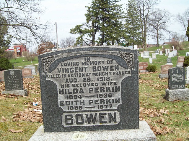 Family Search: When Sergeant Vincent Bowen was born in September 1892, in Stourport-on-Severn, Worcestershire, England, his father, William Bowen, was 20 and his mother, Annie Elizabeth Chell, was 22. He married Hilda Perkin on 2 January 1915, in Guelph, Wellington, Ontario, Canada. He immigrated to Quebec City, Quebec, Canada in 1909 and lived in Areley Kings, Worcestershire, England, United Kingdom in 1901 and Wellington, Ontario, Canada in 1911. He registered for military service in 1914. In 1914, at the age of 22, his occupation is listed as carpet weaver. He died on 26 August 1918, in Arras, Pas-de-Calais, France, at the age of 25, and was buried in Achicourt, Pas-de-Calais, France.