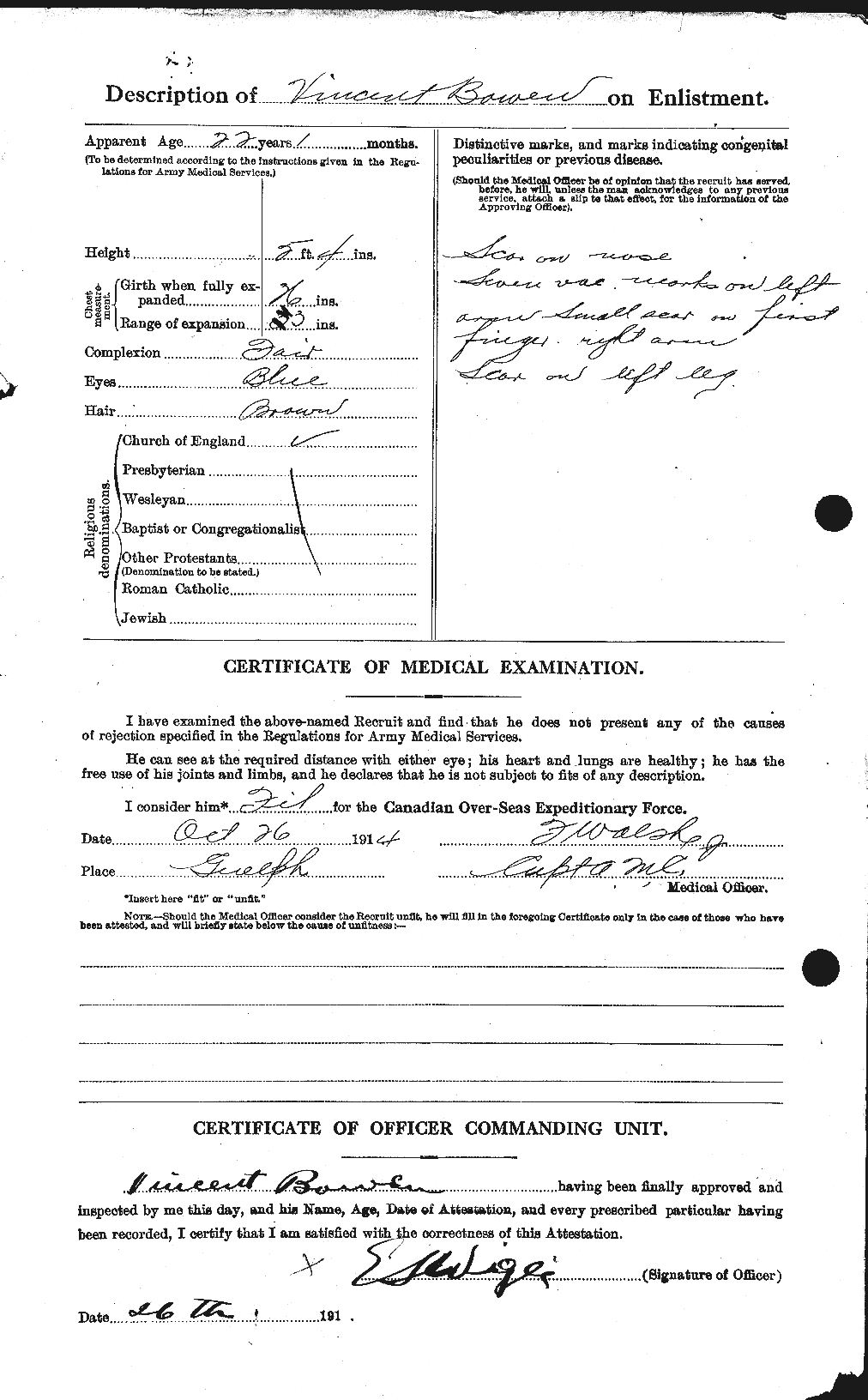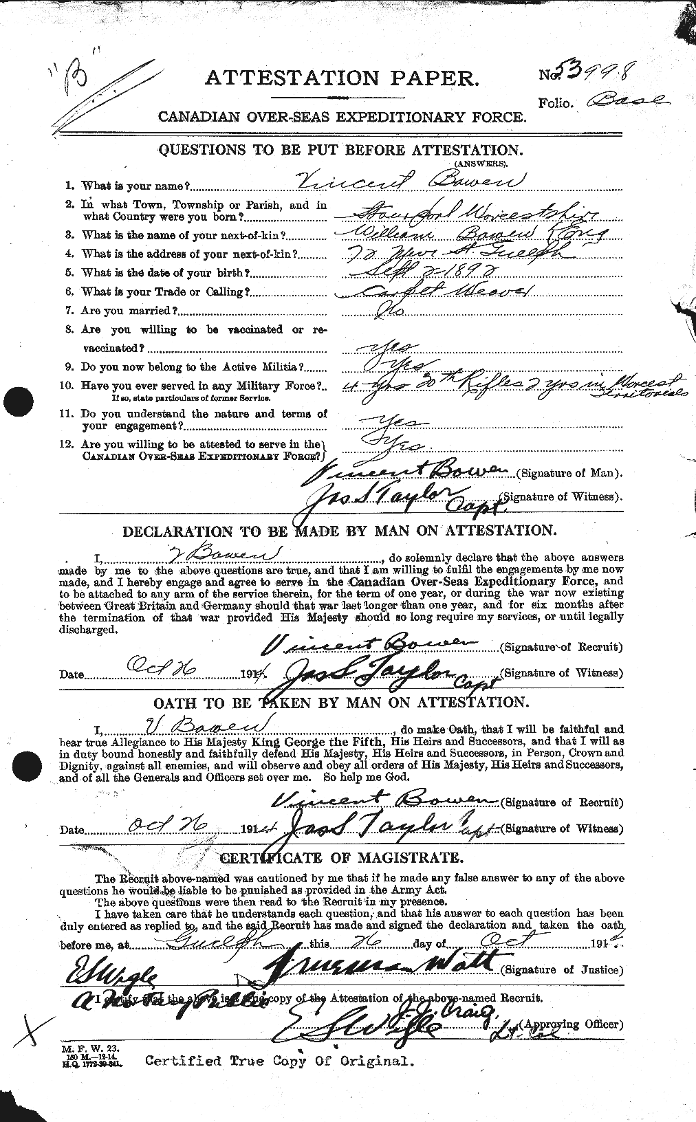 | October 26, 1914 | Enlists | Enlists at Guelph, Ontario. He lists his trade as a carpet weaver and is single. He notes is prior military service in England and lists his next-of-kin as William Bowen. He assigned to “B” Company.