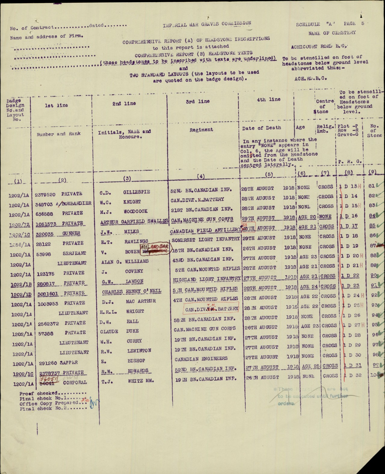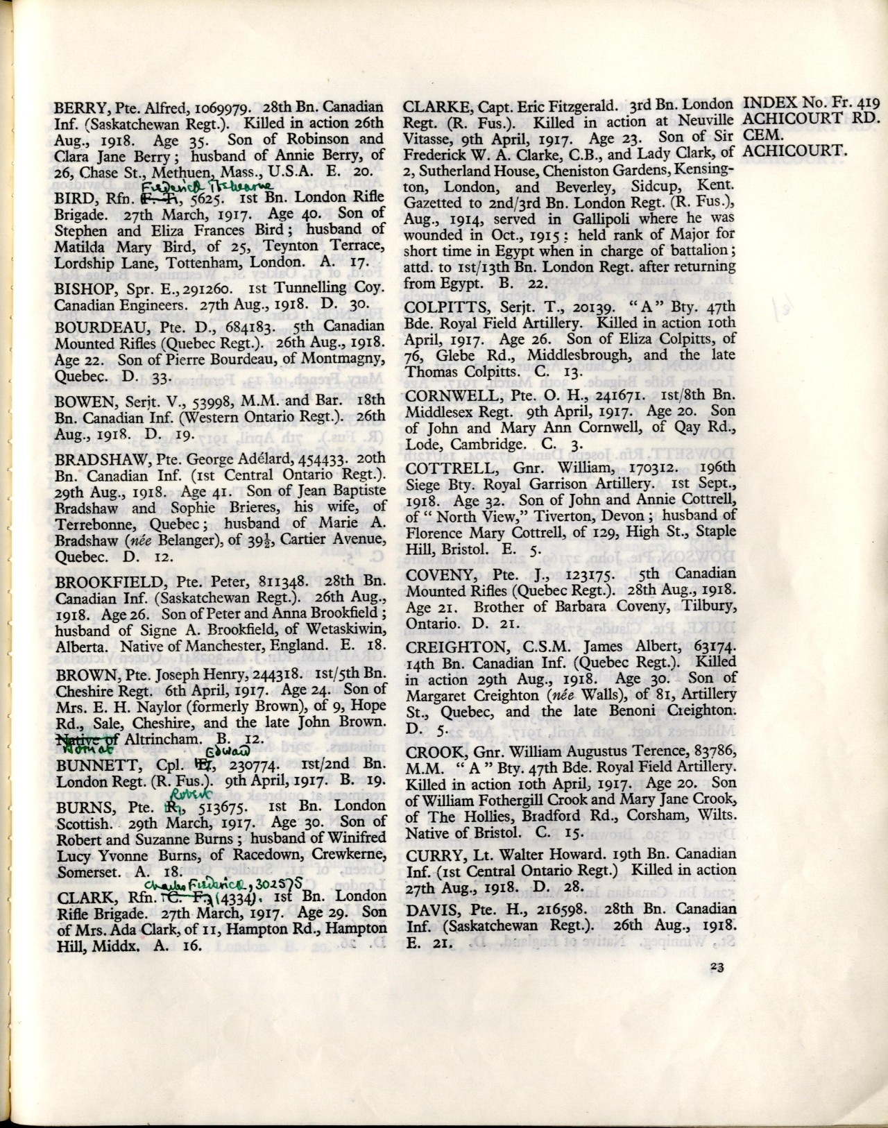 | August 26, 1918 | Killed in Action | Circumstances of Death records: “Killed in Action” During operations in front of ARRAS, this soldier was hit in the stomach and instantly killed, by an enemy rifle bullet.