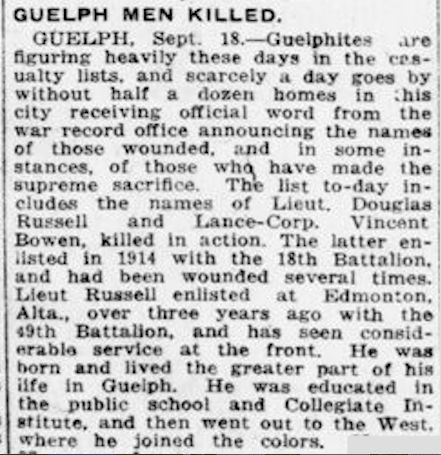 GUELPH, Sept. 18. – Guelphites are figuring heavily these days in the casualty lists, and scarcely a day goes by without half a dozen homes in this city receiving official word from the war record office announcing the names of those wounded, and in some instances, of those who have made the supreme sacrifice. The list to-day includes the names of Lieut. Douglas Russell and Lance-Corp. Vincent Bowen, killed in action. The latter enlisted in 1914 with the 18th Battalion, and had been wounded several times. Lieut. Russell enlisted at Edmonton, Alta., over three years ago with the 49th Battalion, and has seen considerable service at the front. He was born and lived the greater part of his life in Guelph. He was educated in the public school and Collegiate Institute, and then went out to the West, where he joined the colors.
