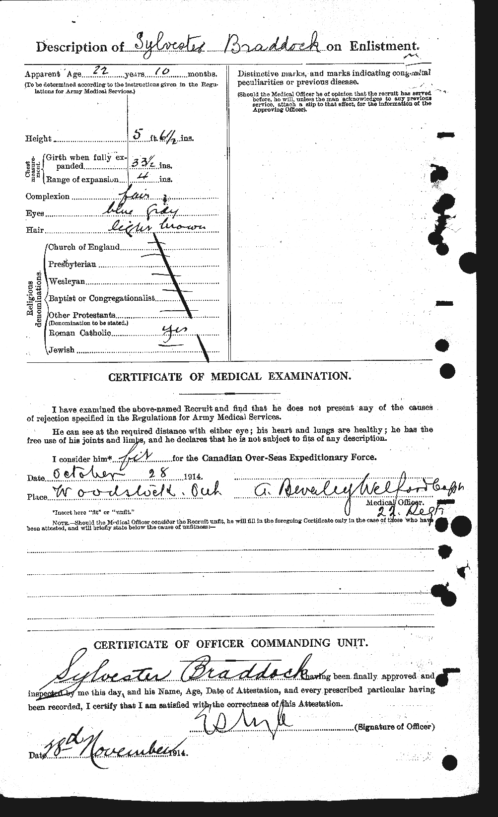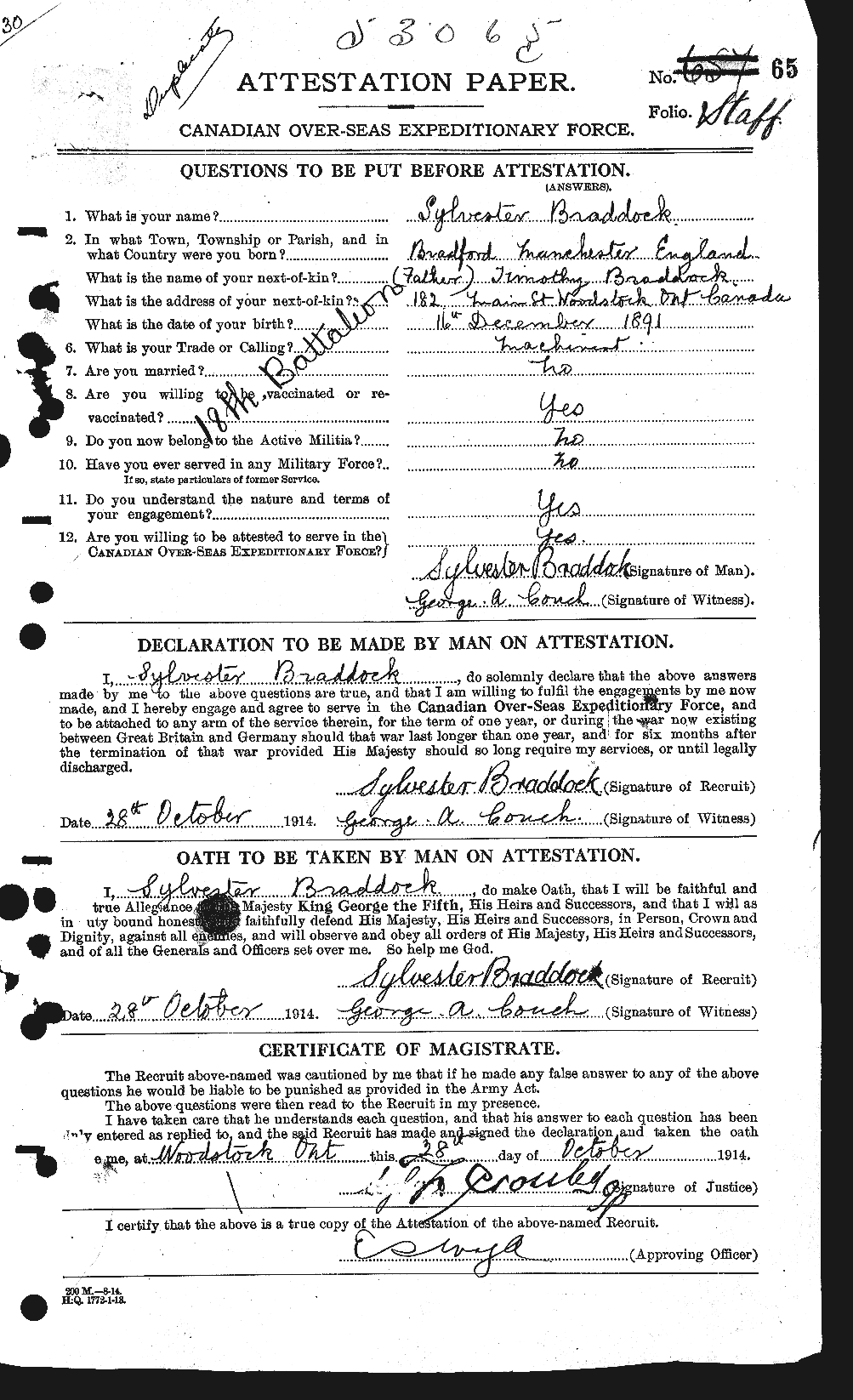 | October 28, 1914 | Enlists | This is an early enlistment. Enlisting at Woodstock, Ontario, Private Braddock was a machinist standing 5’6” tall with a fair complexion, blue-grey eyes, and light-brown hair. He was of the Roman Catholic faith and was 22-years and 10-months old at the time of his enlistment. He named his father, Timothy Braddock as his next-of-kin.