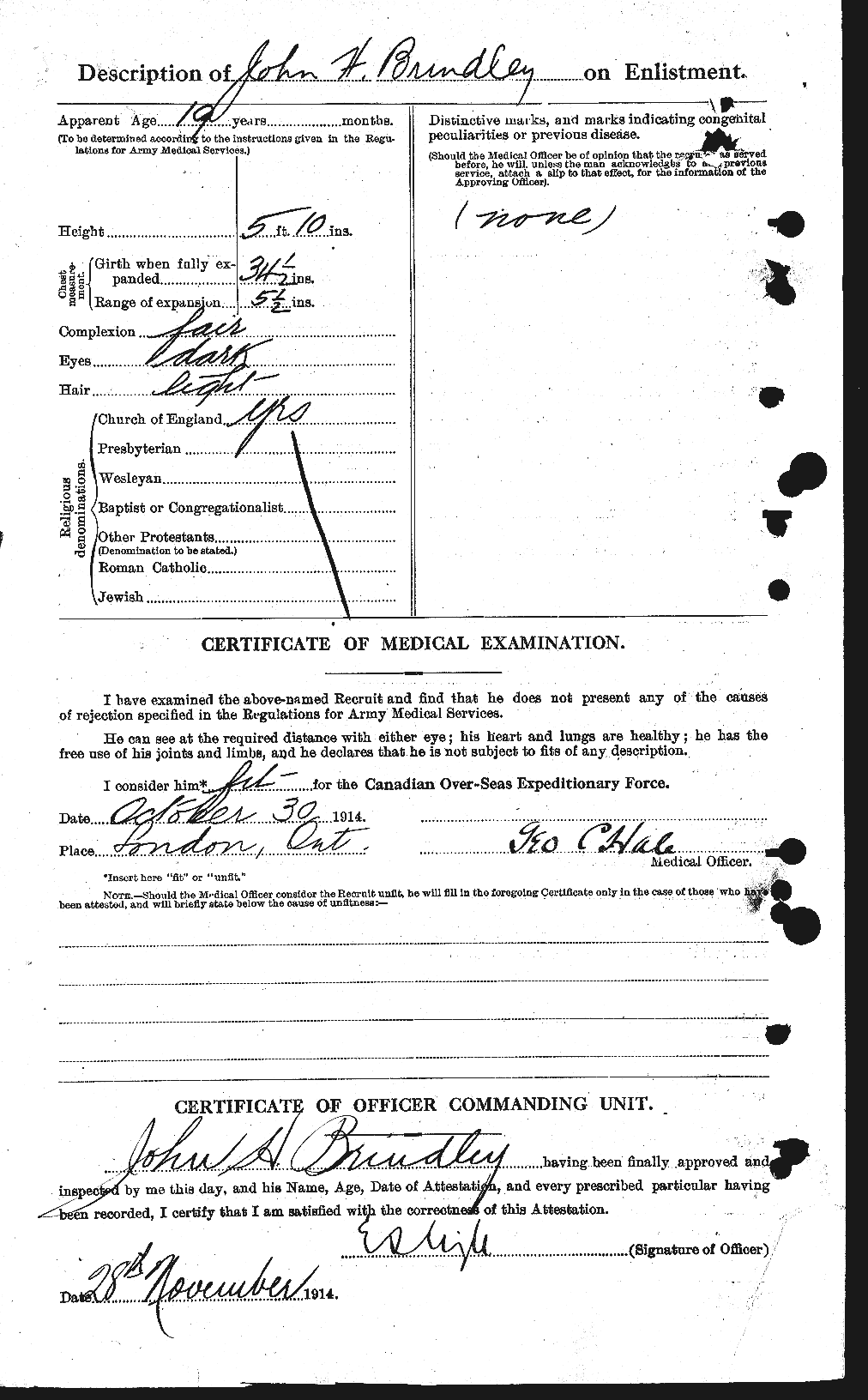 | October 30, 1914 | Enlists C.E.F. | Enlists in London, Ontario as a private soldier with the 18th Battalion. |