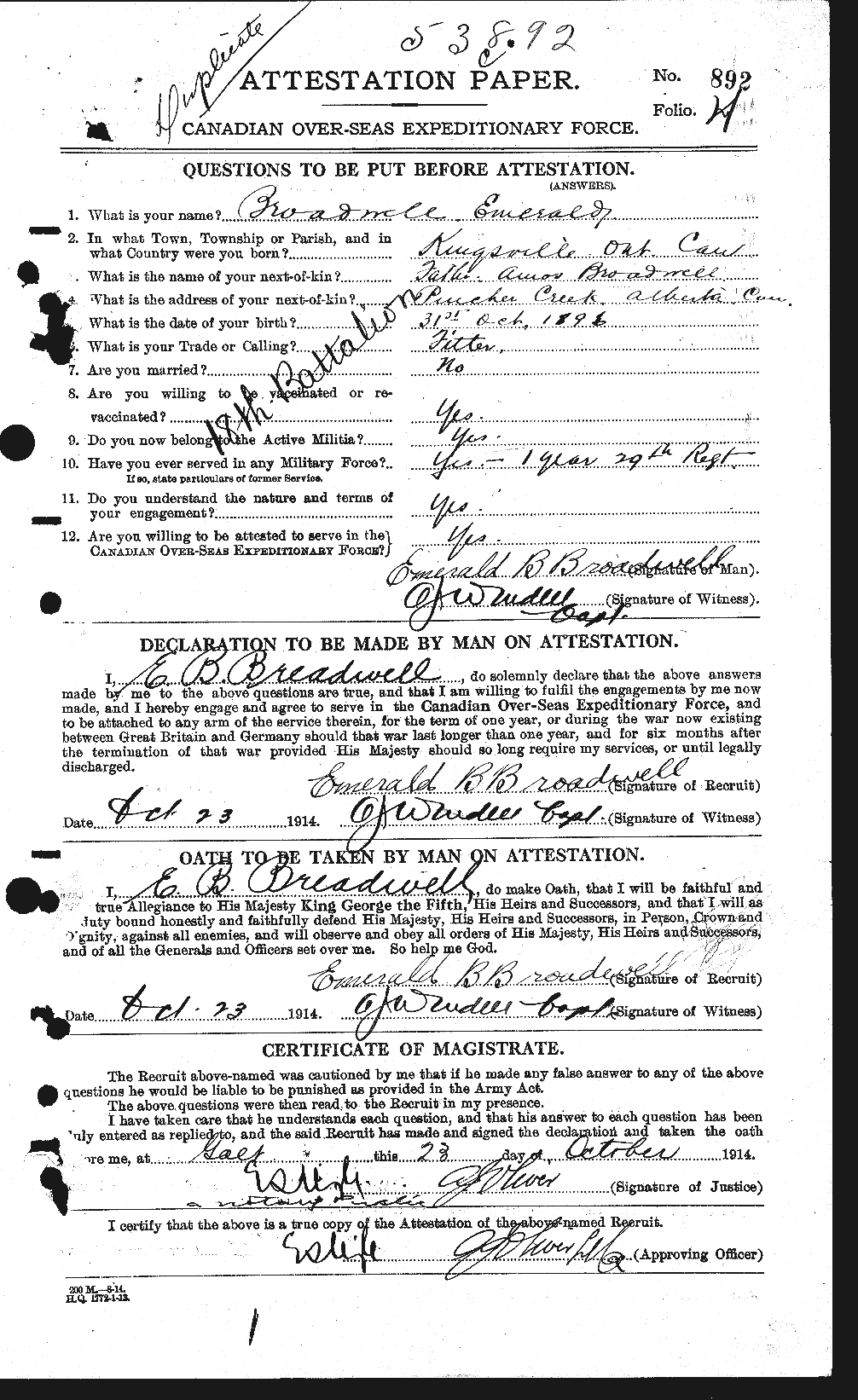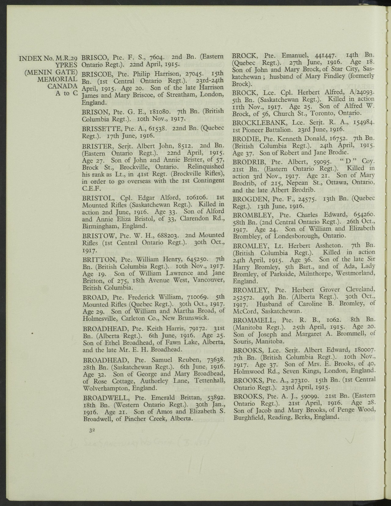 Family Search: When Pte Emerald Britton Broadwell was born on 31 October 1895, in Gosfield South Township, Essex, Ontario, Canada, his father, Amos Broadwell, was 33 and his mother, Elizabeth Sarah Miner, was 32. He lived in Essex, Ontario, Canada in 1901 and Fort Macleod, Willow Creek No. 26, Alberta, Canada in 1911. He registered for military service in 1914. He died on 30 January 1916, in Belgium, at the age of 20, and was buried in Ieper, West Flanders, Belgium.