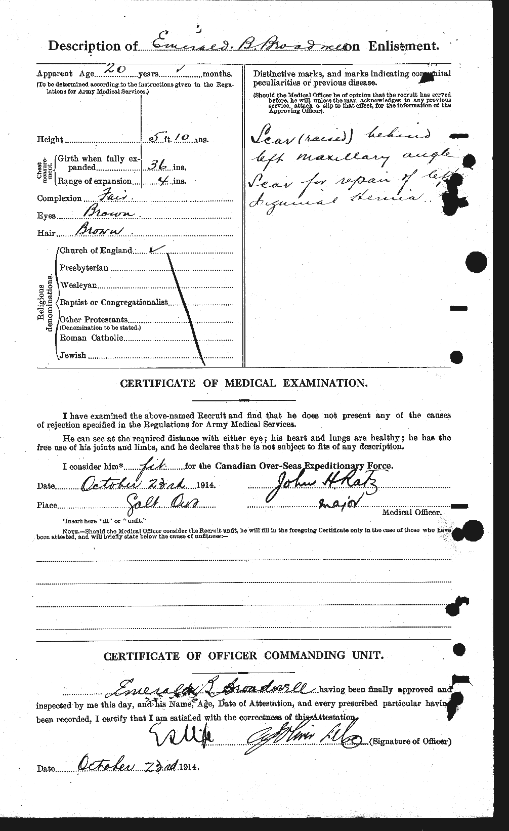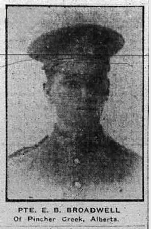 GALT, June 20 – Pte Emerald B. Broadwell, a former Galtonian, reported missing on Ferbruary 15, is now officially reported killed, his father, Amos Broadwell, of Pincher Creek, Alta., having been notified to this effect. The young man enlisted with the 18th Battalion. He was 20 years of age and was born at Kingsville, Ont. He was serving his apprenticeship at the Goldie & McCulloch works and lived in Galt for three years.