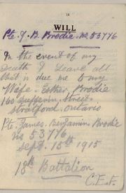 Family Search: When Private James Benjamin Brodie was born on 4 September 1874, in Clerkenwell, London, England, United Kingdom, his father, William Timothy Brodie, was 40 and his mother, Susan Boor, was 37. He married Esther Conyard on 13 August 1906, in Stratford, Perth, Ontario, Canada. They were the parents of at least 1 son and 2 daughters. He immigrated to Canada in 1905 and lived in Perth, Ontario, Canada in 1911. He registered for military service in 1914. In 1914, at the age of 40, his occupation is listed as assistant machinist, grand trunk railway in Stratford, Perth, Ontario, Canada. He died on 25 February 1916, in Ieper, West Flanders, Belgium, at the age of 41, and was buried in Voormezele, West Flanders, Belgium.