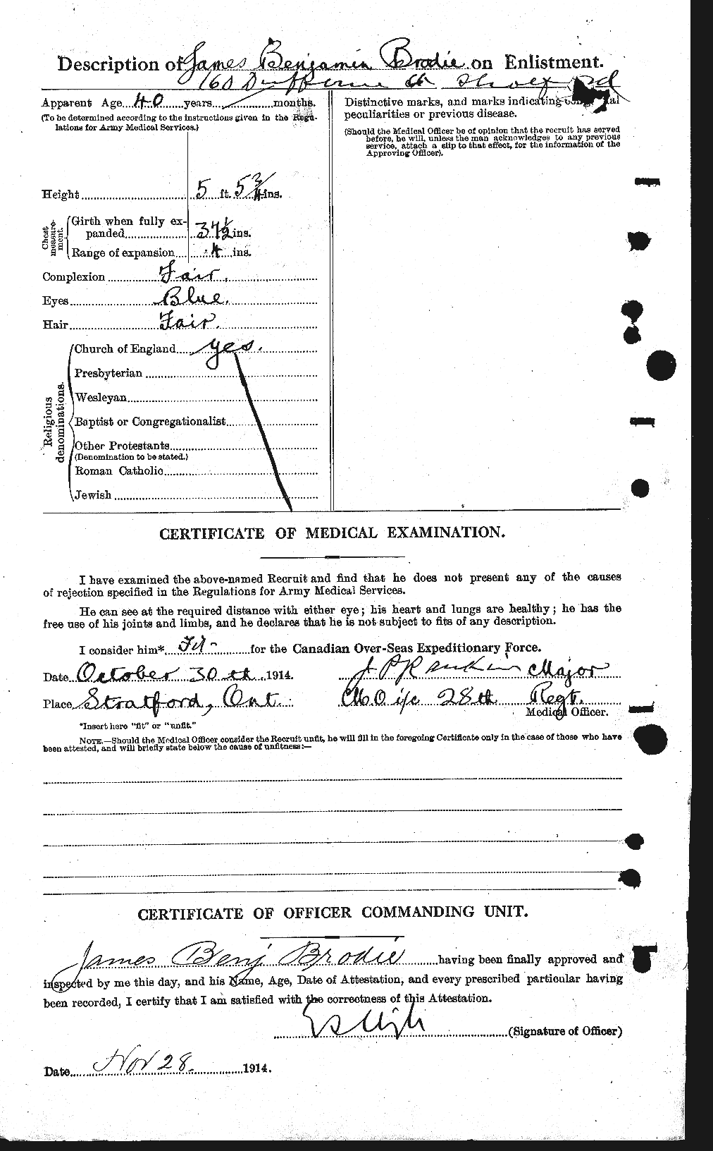 Family Search: When Private James Benjamin Brodie was born on 4 September 1874, in Clerkenwell, London, England, United Kingdom, his father, William Timothy Brodie, was 40 and his mother, Susan Boor, was 37. He married Esther Conyard on 13 August 1906, in Stratford, Perth, Ontario, Canada. They were the parents of at least 1 son and 2 daughters. He immigrated to Canada in 1905 and lived in Perth, Ontario, Canada in 1911. He registered for military service in 1914. In 1914, at the age of 40, his occupation is listed as assistant machinist, grand trunk railway in Stratford, Perth, Ontario, Canada. He died on 25 February 1916, in Ieper, West Flanders, Belgium, at the age of 41, and was buried in Voormezele, West Flanders, Belgium.
